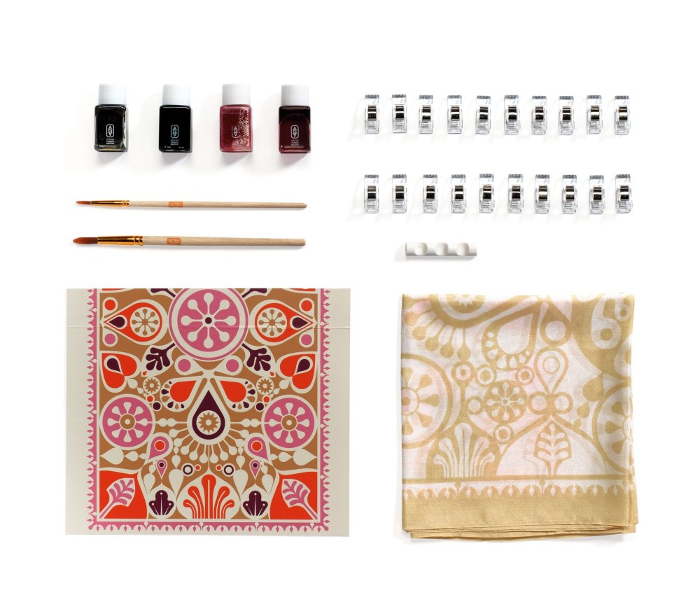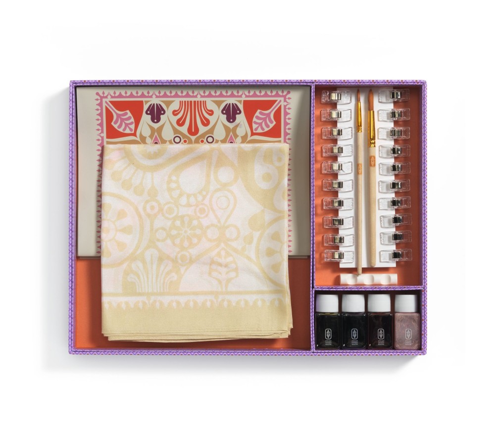 1 foulard di seta (dimensione 130 x 34 cm) pronto per essere dipinto, con la stampa già applicata per delimitare i motivi, 20 mollette per tessuto 4 flaconcini da 30 ml di pittura su seta 2 pennelli 1 supporto per pennello 1 modello da seguire Un dépliant e una carta con codice QR che rimanda a un video tutorial per scoprire l’attività
