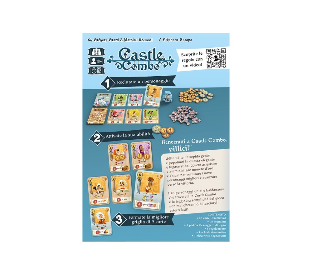Castle Combo è un universo di strategia e creatività. Con le sue carte splendidamente illustrate da Stéphane Escapa e componenti di alta qualità, questo gioco non è solo un piacere per la mente ma anche per gli occhi. Ogni partita è un'opportunità per esplorare nuove strategie e scoprire combinazioni mai viste prima. Castle Combo offre un'esperienza di gioco unica che stimolerà la tua mente e ti terrà incollato al tavolo. Non perdere l'occasione di aggiungere questo gioiello alla tua collezione!
