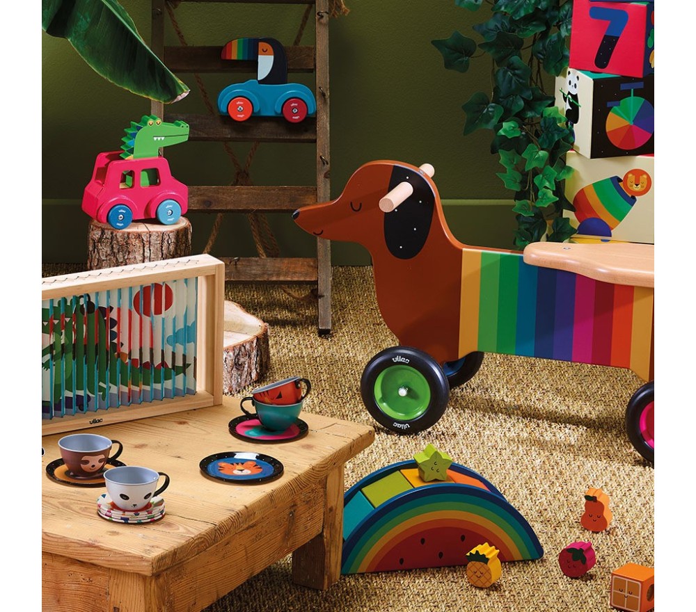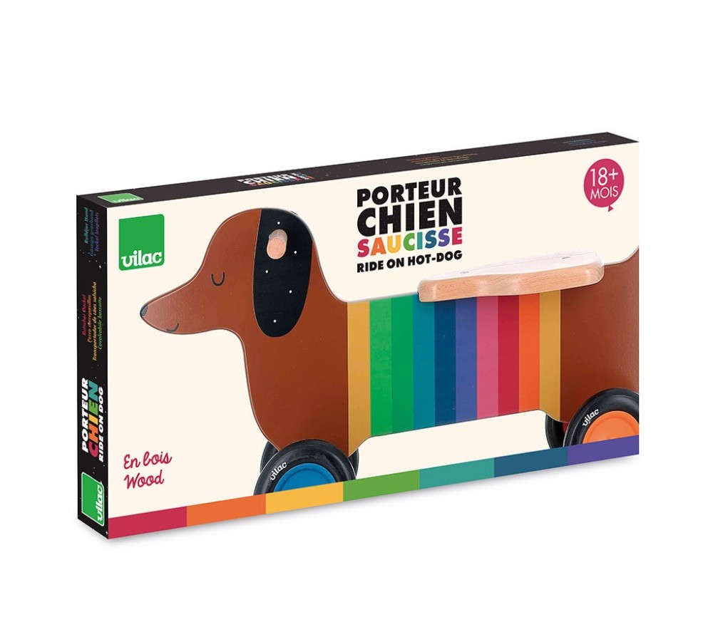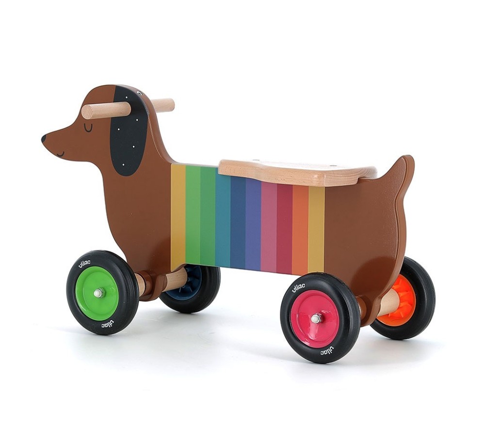 Questo cavalcabile in legno a forma di cagnolino bassotto è simpaticissimo, colorato e solido, perfetto per i primi esperimenti in movimento dei più piccoli.