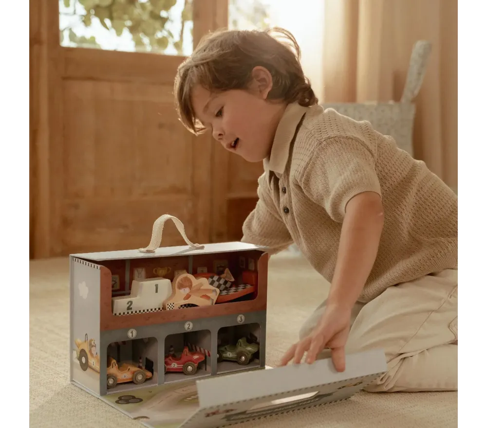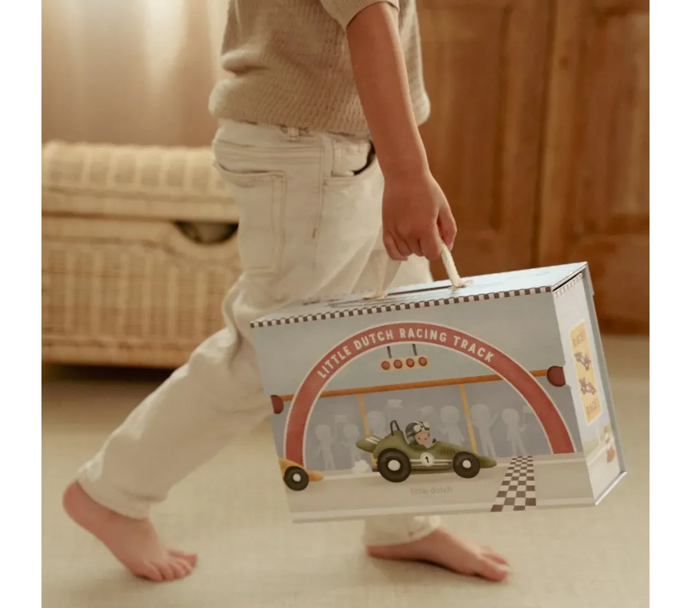 Scaldate i motori! Questa valigetta in cartone robusto svela al suo interno un fantastico circuito, per gare mozzafiato.