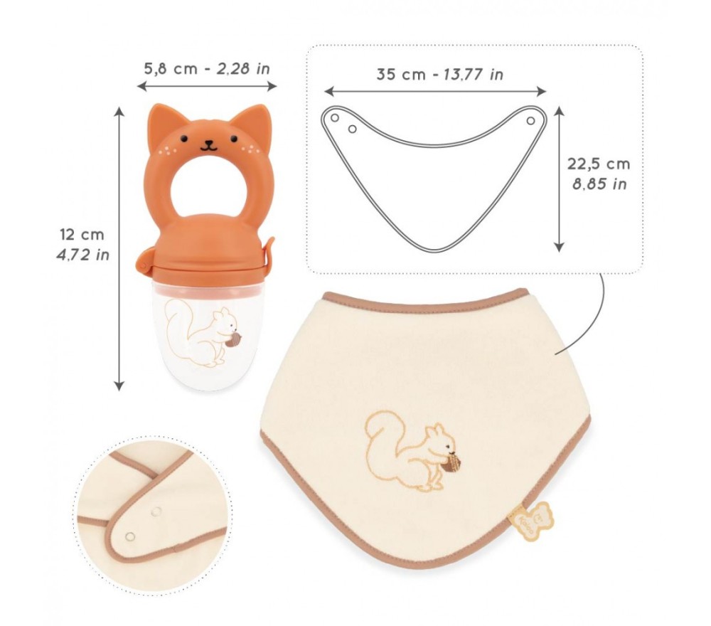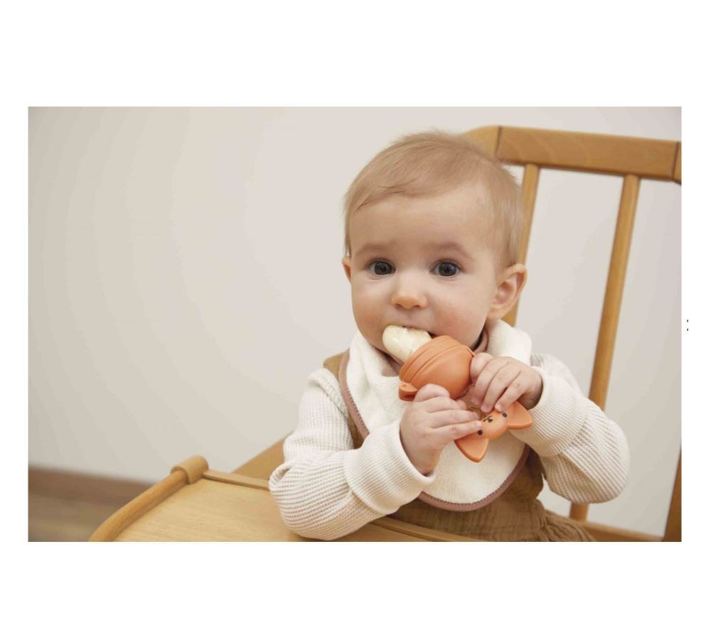 Il ciuccio, a forma di scoiattolo, è semplicissimo da usare: basta inserire frutta o verdura all'interno della capsula, chiuderla e lasciare che il bambino mordicchi e succhi la punta in modo indipendente.