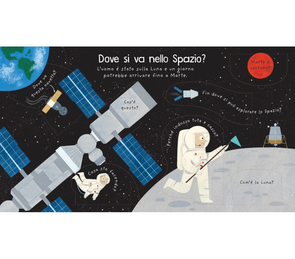 Che effetto fa andare nello Spazio? Come ci si arriva? E che fanno gli astronauti tutto il giorno? Un bellissimo libro con tante alette da sollevare per trovare le risposte alle domande dei piccolini sul mondo che ci circonda.