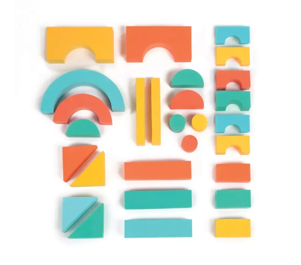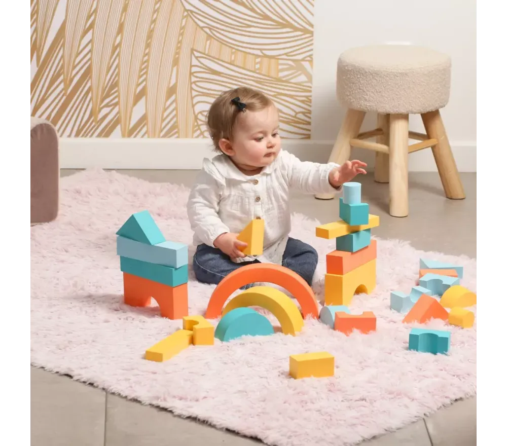 Un set da 28 blocchi in morbido e leggero foam (gommpiuma) che stimoleranno la fantasia e la coordinazione occhio-mano nei più piccoli.