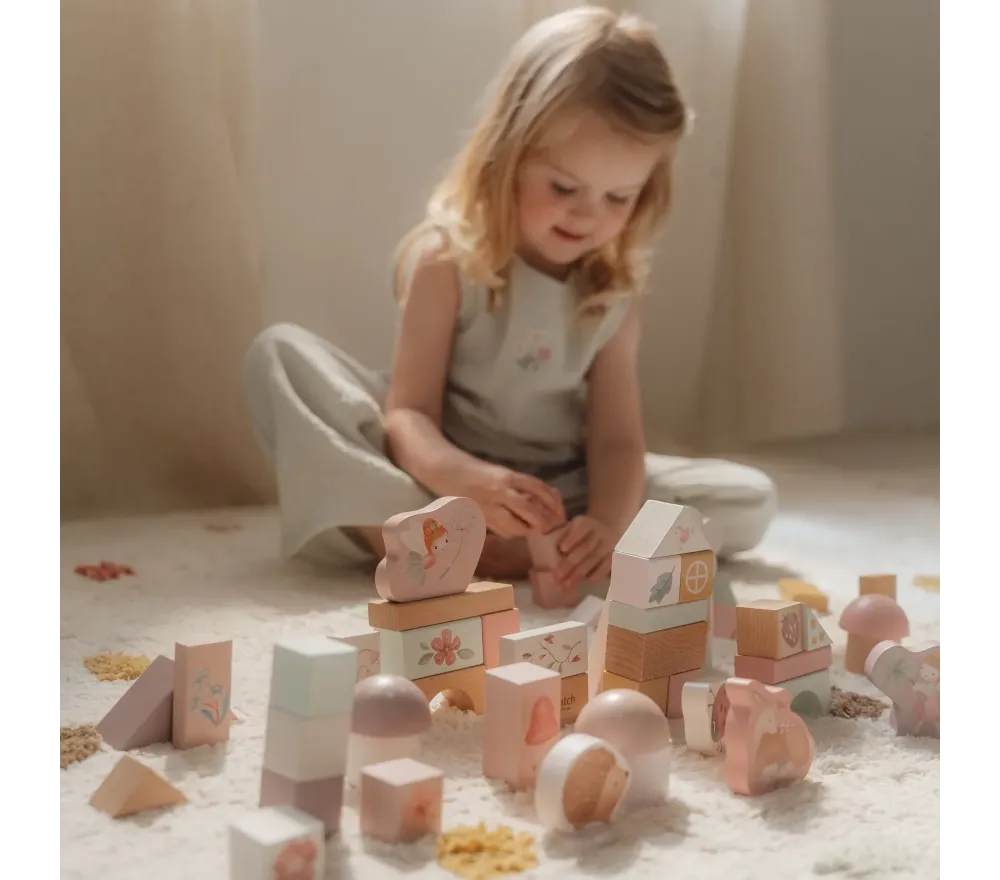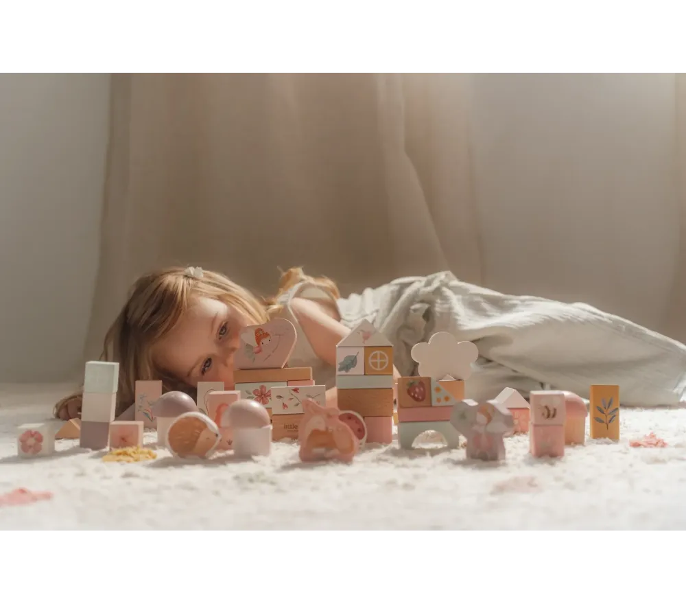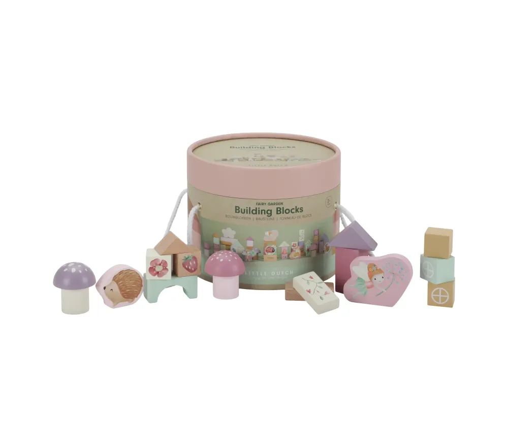 Questi blocchi in legno sono un classico delle costruzioni! La pratica confezione rotonda con coperchio e maniglia contiene 50 blocchi in legno di betulla con vernici ad acqua, con i colori della linea Fairy Garden