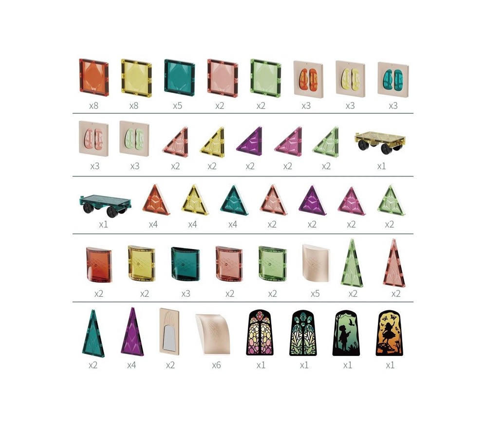 Le forme geometriche sono arricchite da diverse forme dal design unico e speciale che ampliano le possibilità di costruzione. La trasparenza inoltre crea giochi di luce spettacolari!