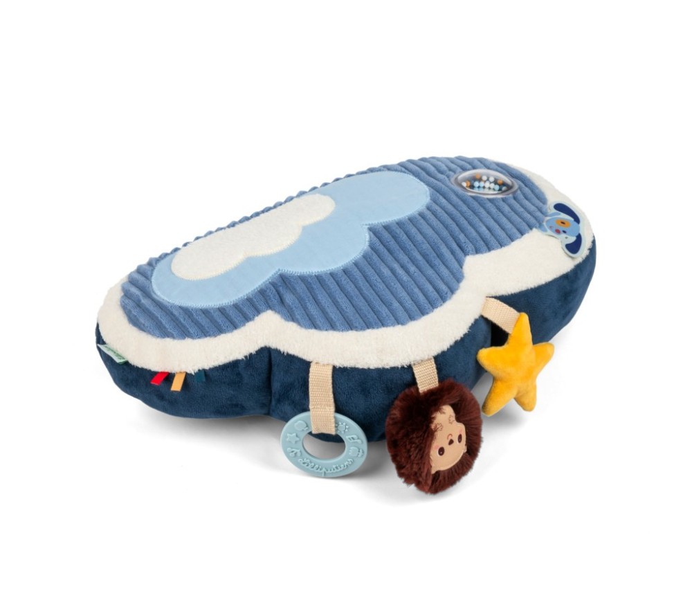 Questo tenero cuscino d'attività a forma di nuvola accompagna il bambino nelle sue prime scoperte: texture, suoni, sfumature di colore. E' perfetto per il tummy time (il gioco a pancia in giù), importante per rafforzare collo, schiena e spalle, facilitando il controllo del capo e lo sviluppo motorio come rotolamento e gattonamento.