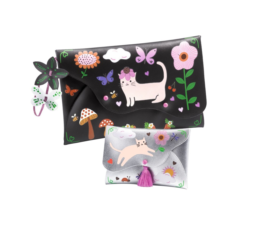Un fantastico set creativo per realizzare 2 meravigliose pochette in ecopelle a tema gatti, da decorare con più di 100 decaldomanie (trasferelli) e accessori.