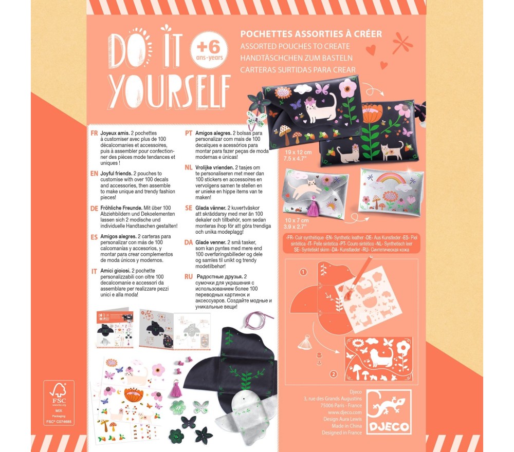 Contenuto: 2 pochette di pelle sintetica (1 grande 19 x 12,5 cm e 1 piccola 10 x 7 cm), 2 schede di decalcomanie, 3 chiusure a vite, 5 pezzi di pelle sintetica, 1 pompon, 1 cinturino rosa metallizzato, 1 foglietto di istruzioni passo dopo passo a colori.