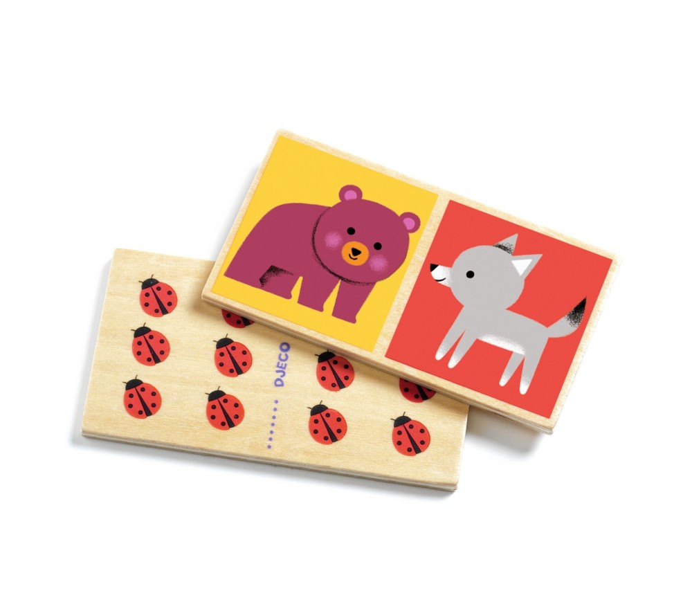 Un primo domino pensato per i bimbi più piccoli: le 28 tessere in legno FSC a tema bosco hanno da un lato gli animali della fattoria e dall'altro i numeri.