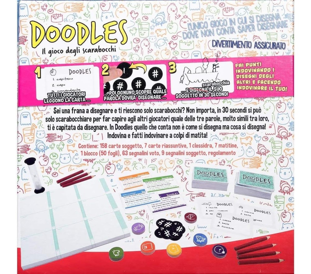 Doodles è un divertente gioco di scarabocchi e intuizione in cui avrete solamente 30 secondi per riuscire a far capire agli altri il vostro disegno, mentre voi dovrete riuscire a capire quello degli altri. Ogni round viene infatti rivelata una carta con 3 soggetti decisamente simili da disegnare, i giocatori dovranno poi estrarre casualemente quale dei 3 dovranno scarabocchiare nel giro di soli 30 secondi. Pronti via, iniziate a disegnare nel miglior modo possibile, al termine del tempo ciascun giocatore dovrà riuscire a capire cosa hanno disegnato gli altri, ottenendo punti in base alla propria capacità di intuizione. Anche colui che disegna ottiene tuttavia punti in base a quanti giocatori riescono a indovinare il proprio capolavoro. Verrà dunque premiata sia la vostra capacità artistica che deduttiva! Al termine della partita, il giocatore con il maggior numero di punti verrà proclamato vincitore.