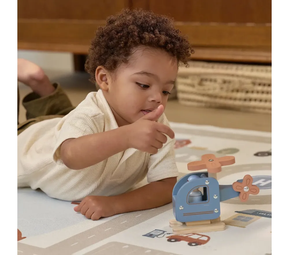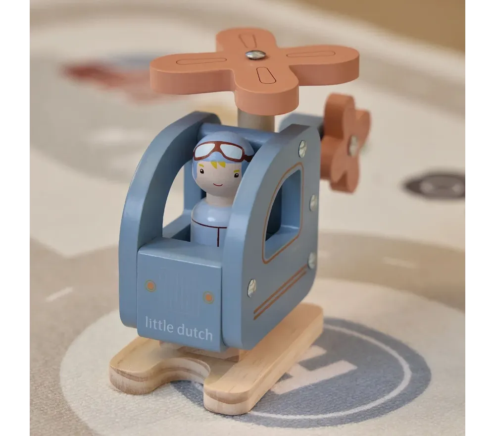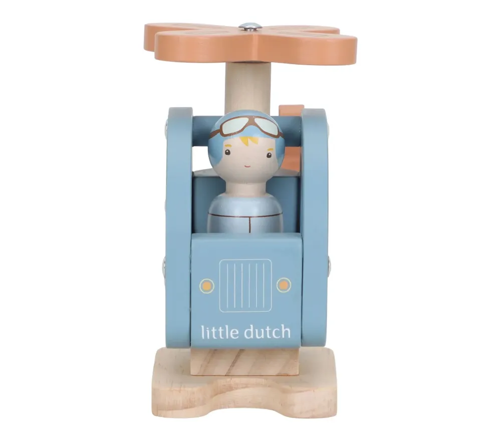 Un fantastico elicottero in legno, con ruote gommate, per vivere incredibili avventure nei cieli! E' compreso anche un personaggio.