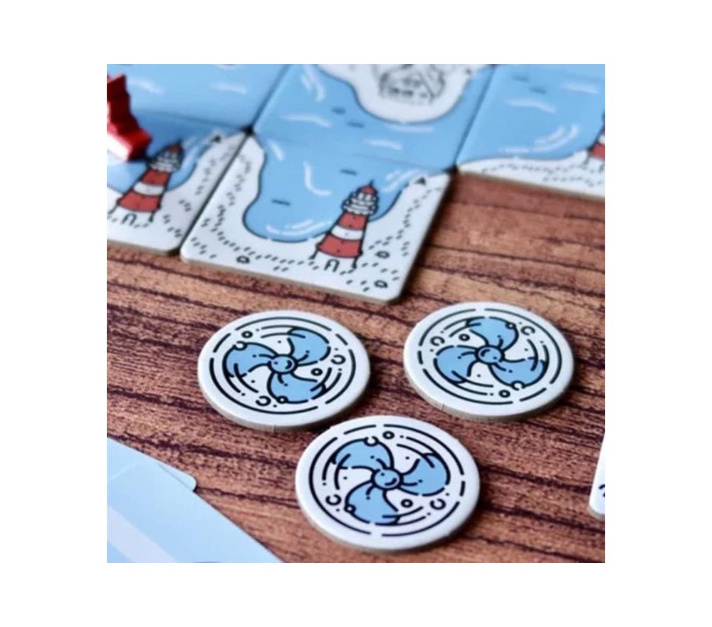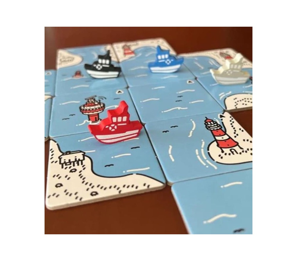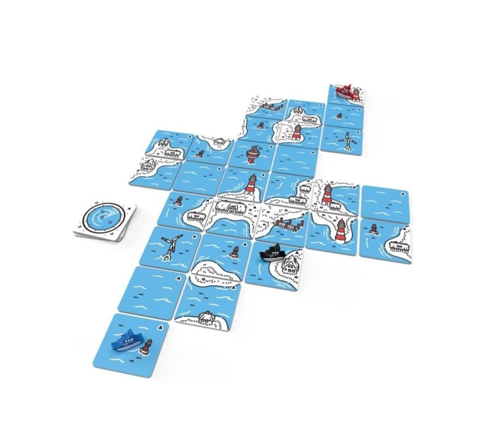 Lavorate insieme per esplorare le acque e per ispezionare fari e boe di vitale importanza. Agite con efficienza, poiché il mare è vasto e il tempo scarseggia! Muovete la vostra nave, piazzate le tessere, e collaborate con i vostri compagni capitani per ottenere una promozione e l’ammirazione di tutti gli abitanti della costa. Nel vostro turno, potete: – piazzare una tessera (fino a un massimo di 2 o 3 a seconda del numero di giocatori) rispettando le regole di piazzamento (adiacente alla tessera con la propria nave, orientamento corretto e corrispondenza). Poi, spostate la nave lungo il mare sulla tessera appena posizionata. – muovere la propria nave utilizzando i gettoni movimento. – scambiare una tessera con una di un compagno. La partita termina quando finiscono le tessere. Si ottengono punti per le tessere esplorate.