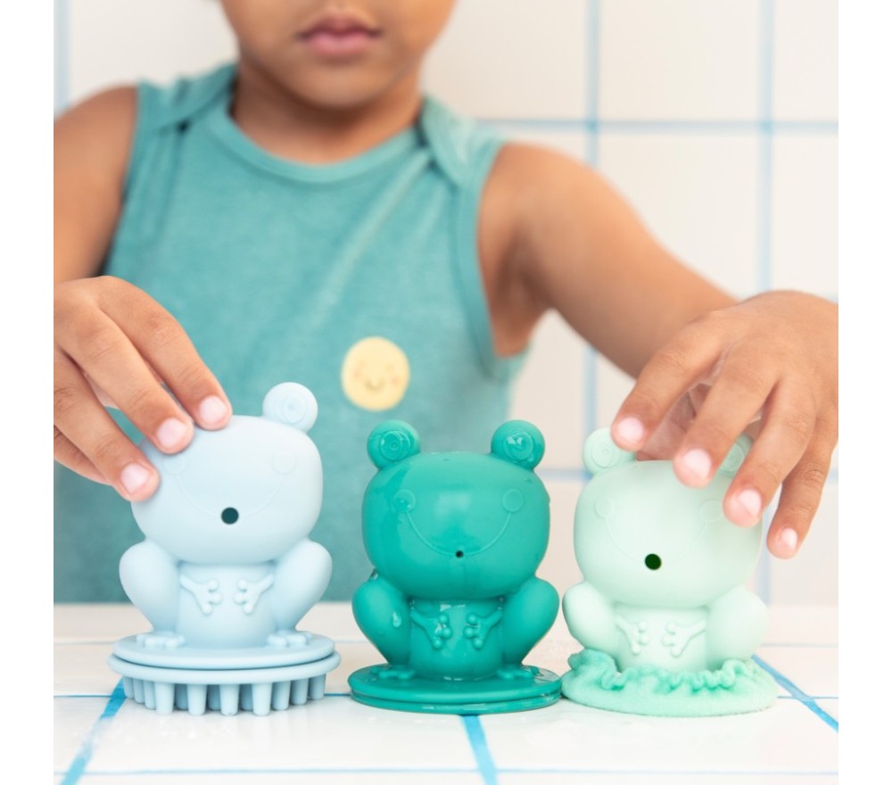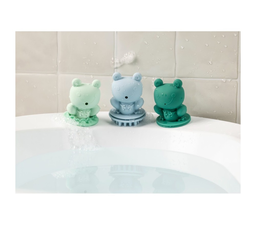 Un set di tre simpatiche ranocchie in silicone per rendere il bagno super divertente! Tutte e tre sono degli spruzzini, ma ognuna ha una caratteristica diversa: una ha una superficie massaggiante e spruzza l'acqua a cascata, una una spugnetta morbida che fa la schiuma e l'ultima una ventosa con tappo rimovibile.