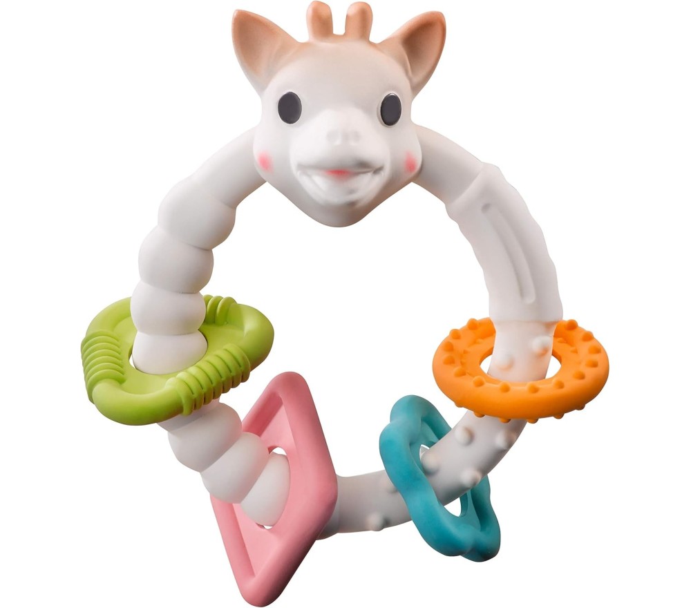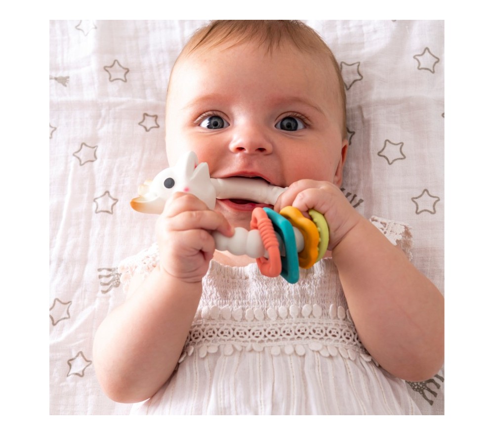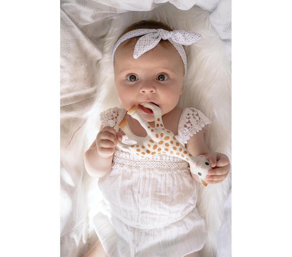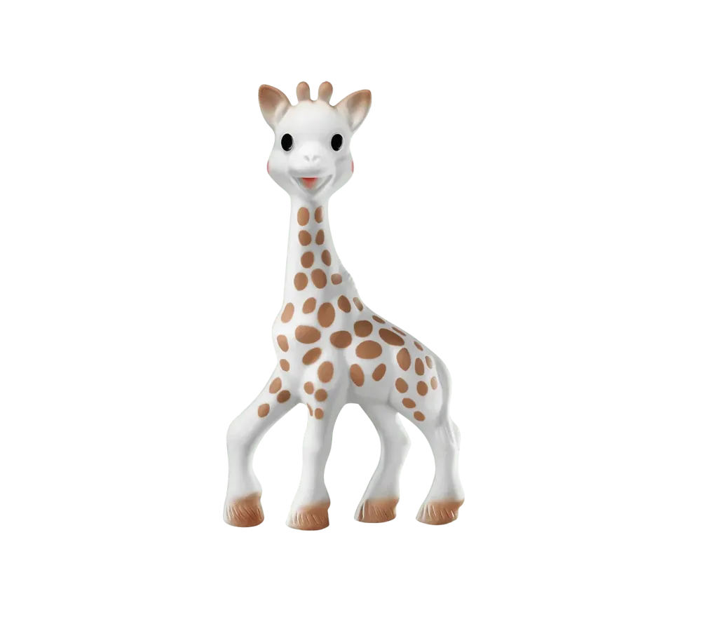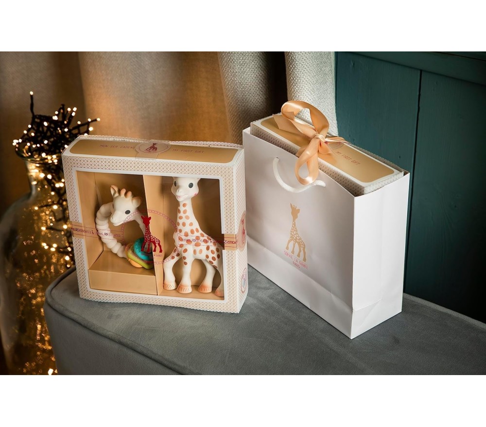 Dalla linea di Sophie la Giraffa, un cofanetto regalo perfetto per la nascita, contenente una giraffa Sophie e un dentaruolo con textures diverse, entrambi in caucciù naturale.