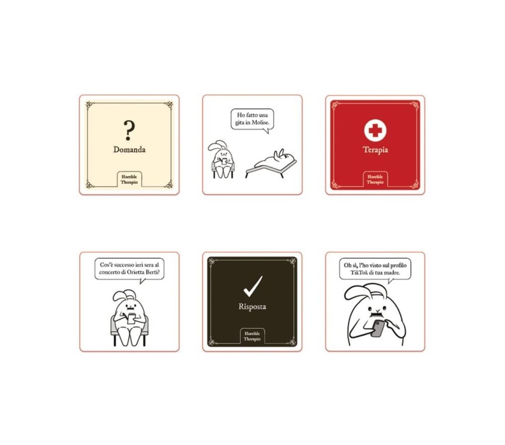 70 carte Domanda, 135 carte Risposta, 175 carte Terapia, 1 regolamento.