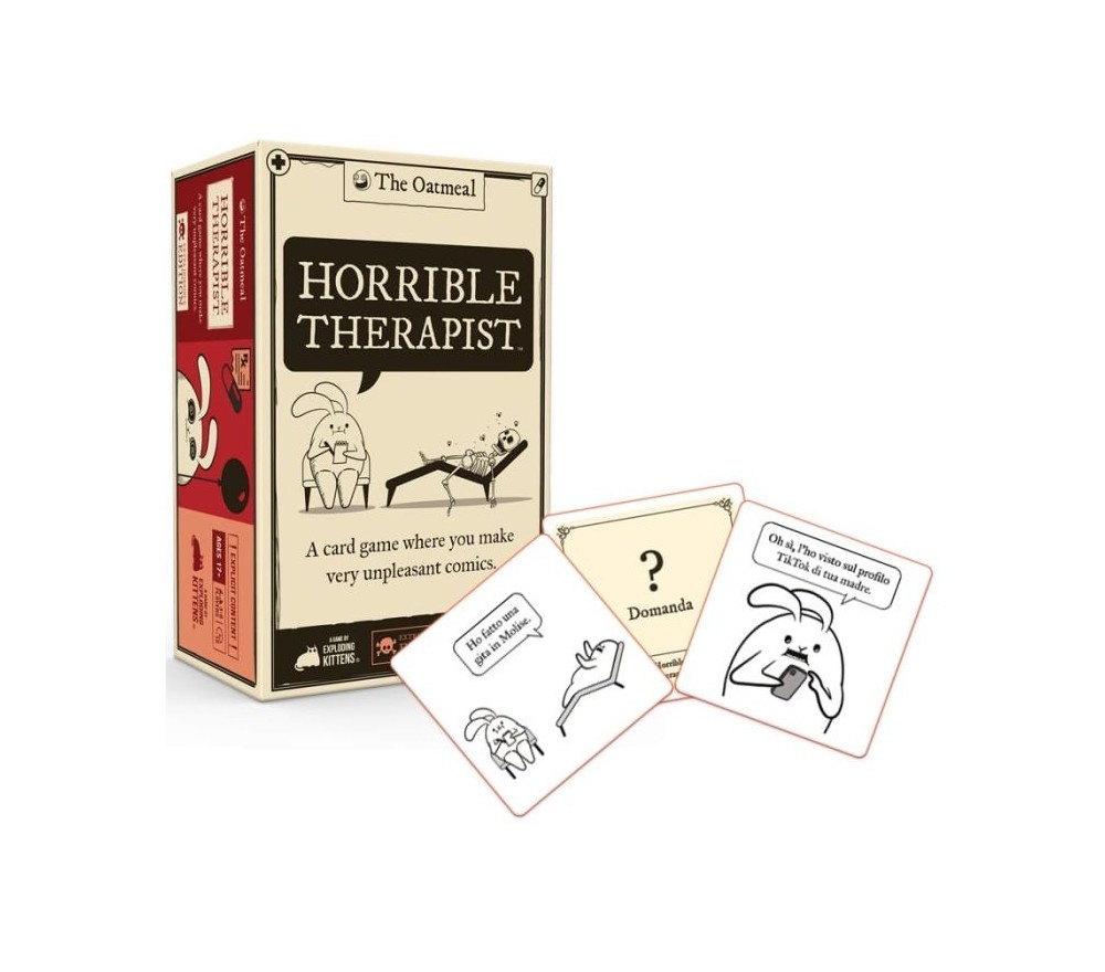 Horrible Therapist è un gioco party irriverente e fuori di testa che combina l’umorismo di Coco Rido con lo stile esplosivo di Exploding Kittens!