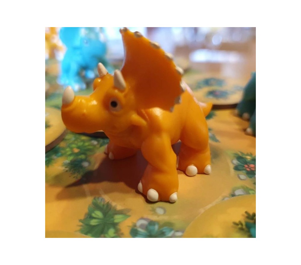 Il gioco include: 4 plance Pascolo, 10 miniature di Triceratopo e una miniatura di Raptor,