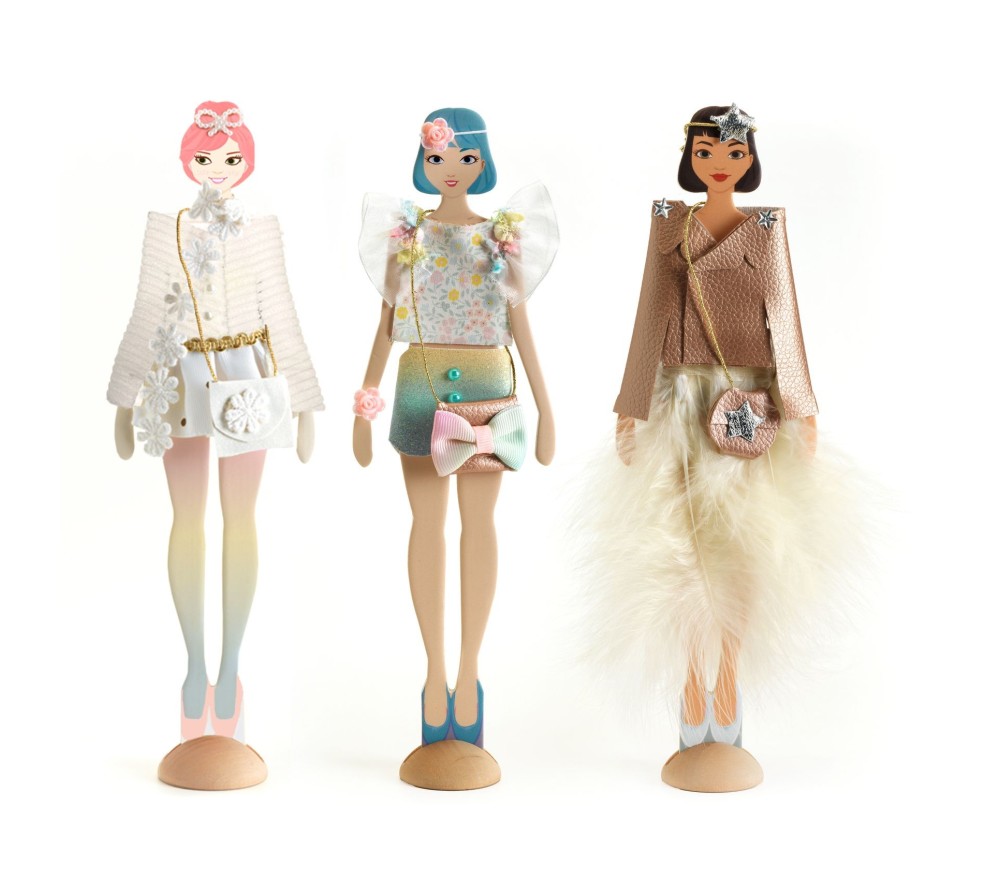Contenuto: 3 bambole, 3 supporti in legno, 3 tessuti stampati, 5 tessuti di vari materiali, 2 fettucce o nastri, 2 fili elastici, 1 foglio di strass autoadesivi, 1 paio di forbici, 1 rullo di adesivo double face, 1 penna, 3 schede di modelli