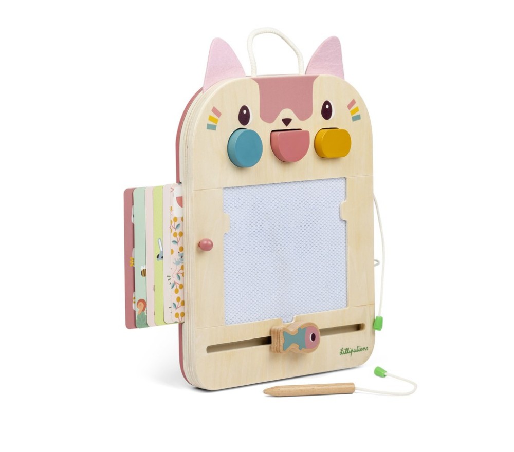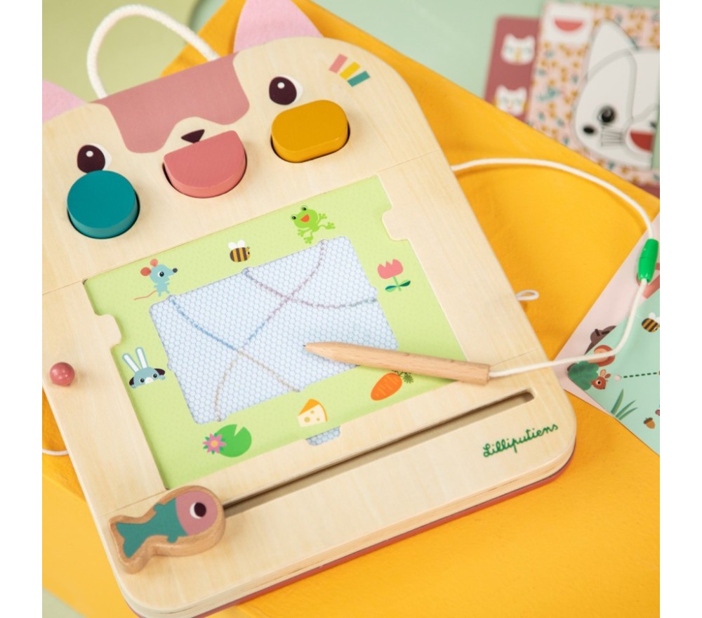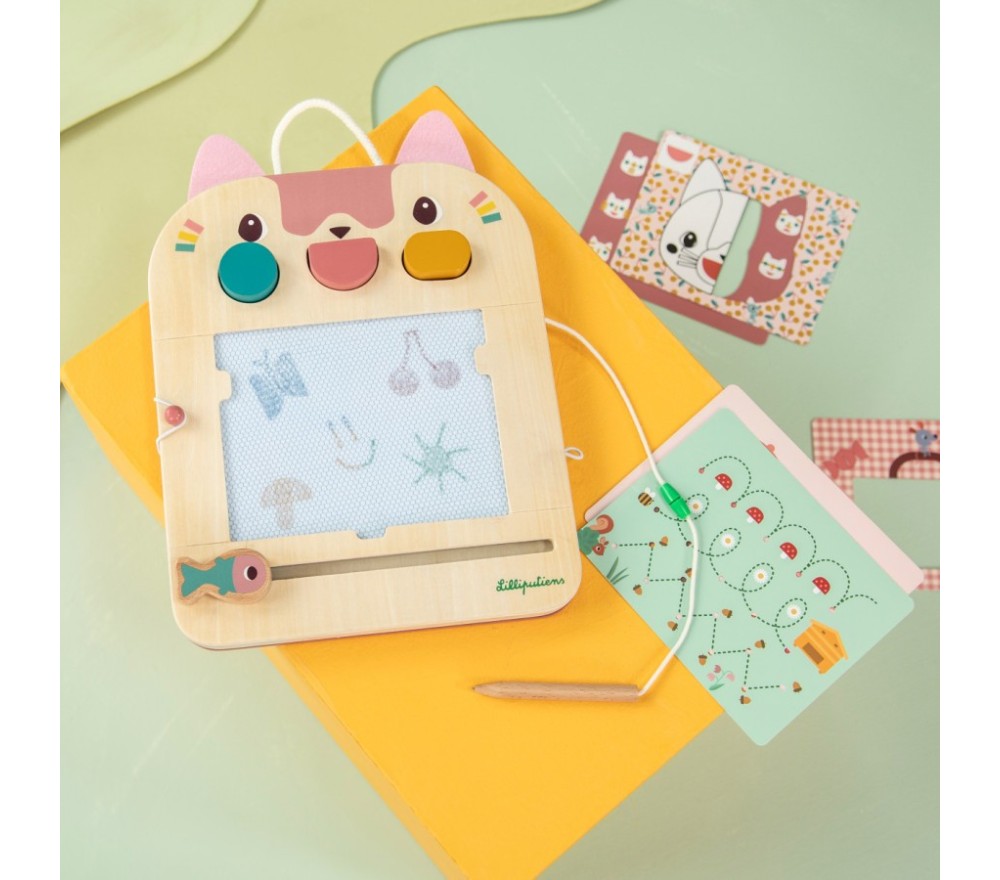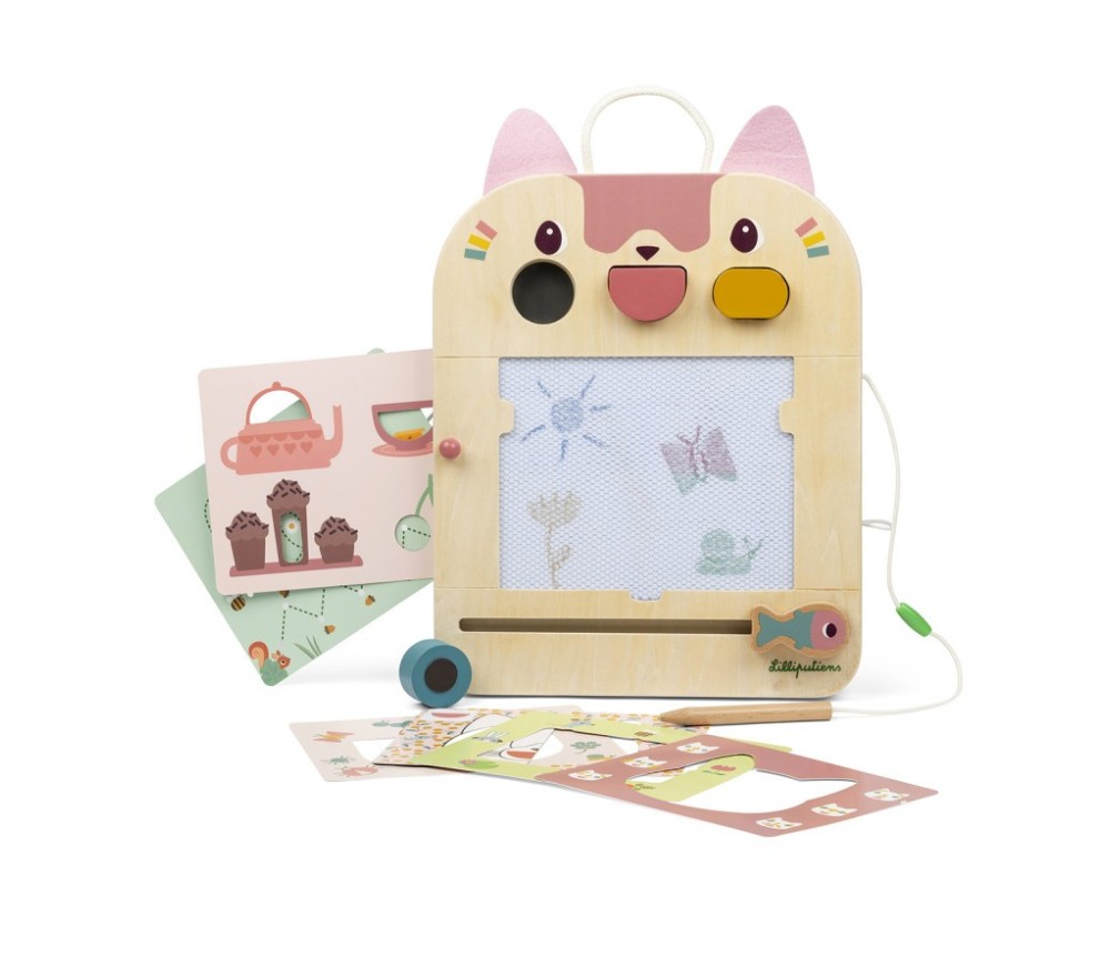 La lavagna magica di Jeanne il gatto è perfetta per disegnare all'infinito! Con la penna in legno (legata, per non perderla!) si scrive o si disegna sulla superficie cerata, che svelerà tre colori diversi. La lavagnetta è inoltre dotata di 3 timbri, 6 schede intercambiabili per fare 12 giochi diversi per stimolare la mente e la creatività!