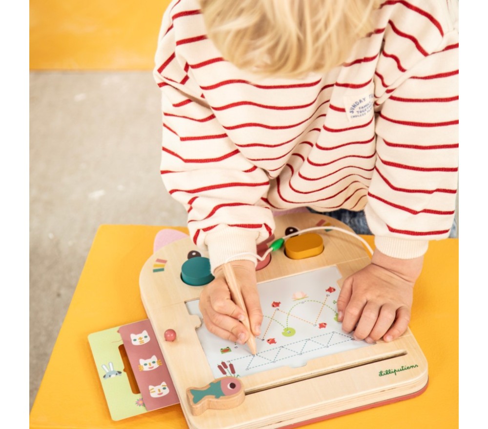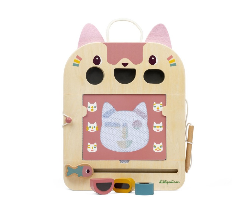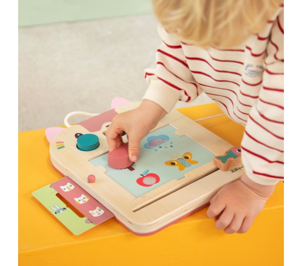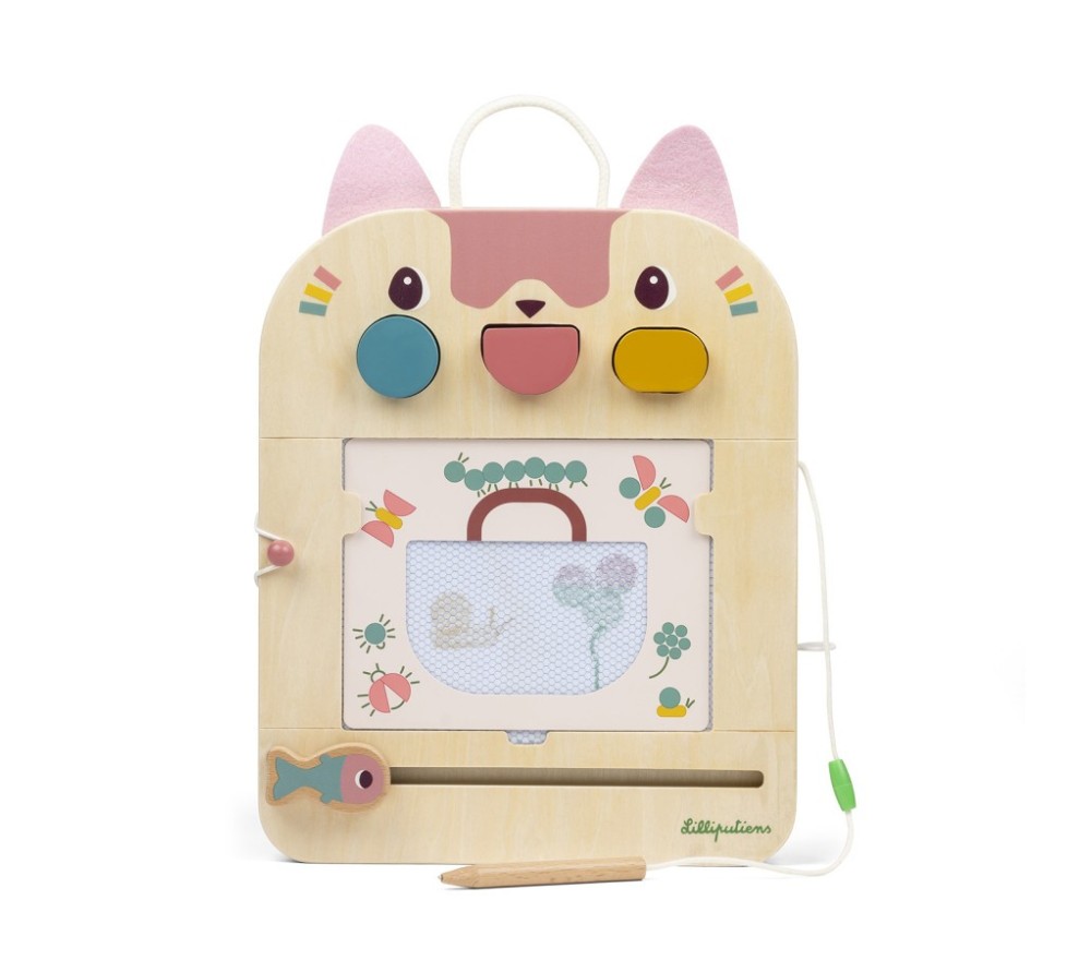 La lavagna magica di Jeanne il gatto è perfetta per disegnare all'infinito! Con la penna in legno (legata, per non perderla!) si scrive o si disegna sulla superficie cerata, che svelerà tre colori diversi. La lavagnetta è inoltre dotata di 3 timbri, 6 schede intercambiabili per fare 12 giochi diversi per stimolare la mente e la creatività!