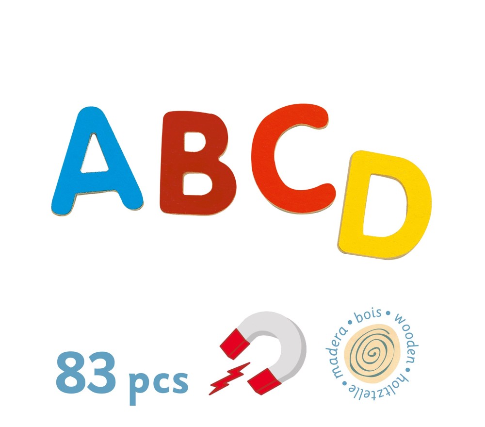 Lettere in legno magnetiche raffiguranti l'alfabeto che possono essere usate su qualsiasi supporto metallico (frigorifero, lavagnette ecc).