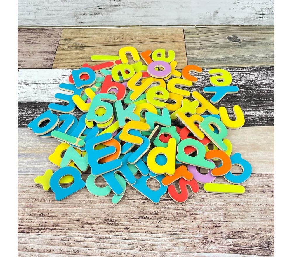 Lettere in legno magnetiche raffiguranti l'alfabeto che possono essere usate su qualsiasi supporto metallico (frigorifero, lavagnette ecc). Coloratissime e facili da afferrare per le piccole mani dei bimbi, sono utili per iniziare a familiarizzare con le lettere e formare le prime parole. 83 pezzi. Dai 4 anni in su.