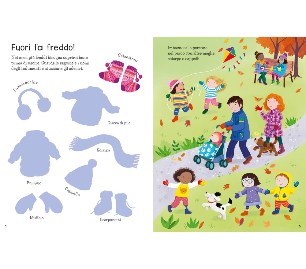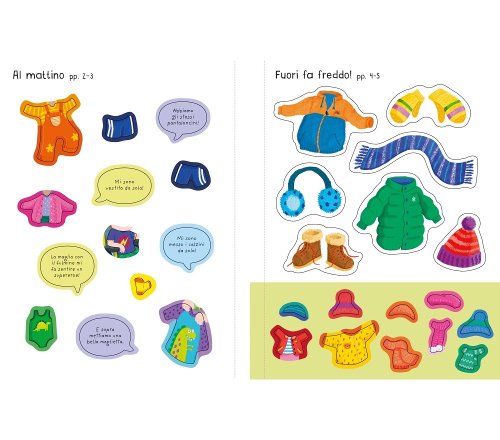 Questo libro introduce i concetti della scelta dei vestiti per la giornata, del vestirsi in modo appropriato in base al meteo e alla stagione e del cominciare a vestirsi da soli, un'abilità importante in vista dell'inizio della scuola. I bambini si divertiranno a scegliere i vestiti per diversi personaggi in tante scenette differenti, da una giornata piovosa nel bosco a una calda gita in spiaggia.