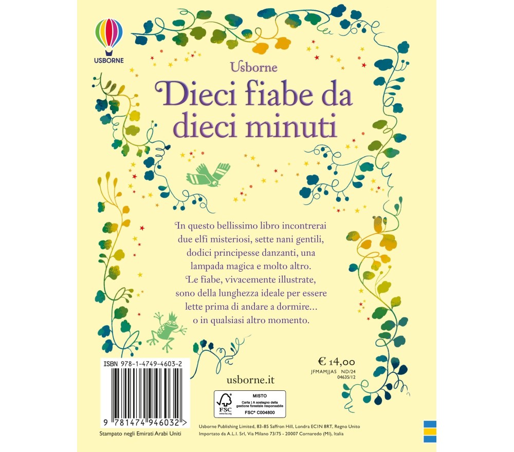 Una magica raccolta di fiabe rielaborate per i piccoli lettori, tra cui La lampada di Aladino, Cappuccetto Rosso e Biancaneve e i sette nani. Ogni storia, arricchita da splendide illustrazioni, si legge in soli dieci minuti ed è perfetta prima della nanna.