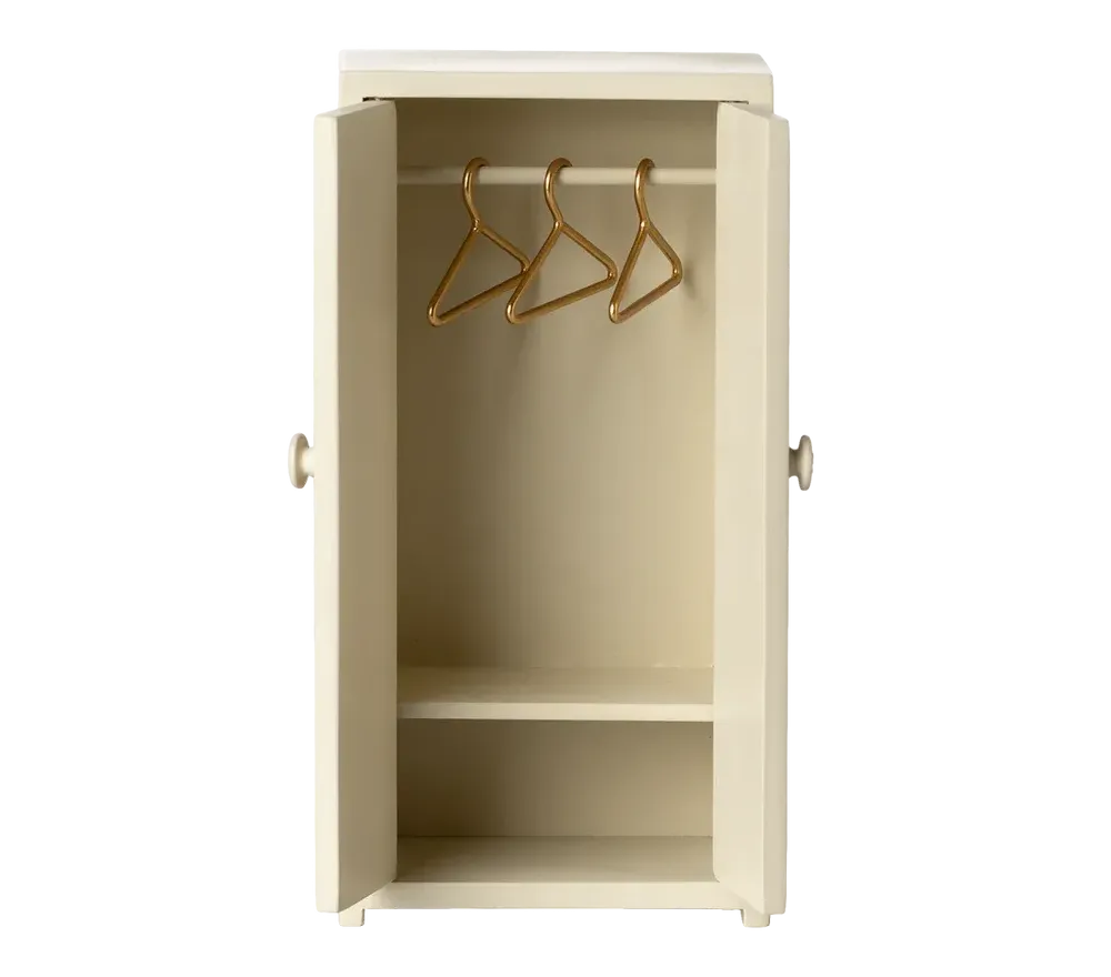 Un adorabile armadio in legno color panna per i topini Maileg. Al suo interno ha un ripiano e 3 appendini dorati. Alto 14 cm, largo 7 cm e profondo 4 cm.