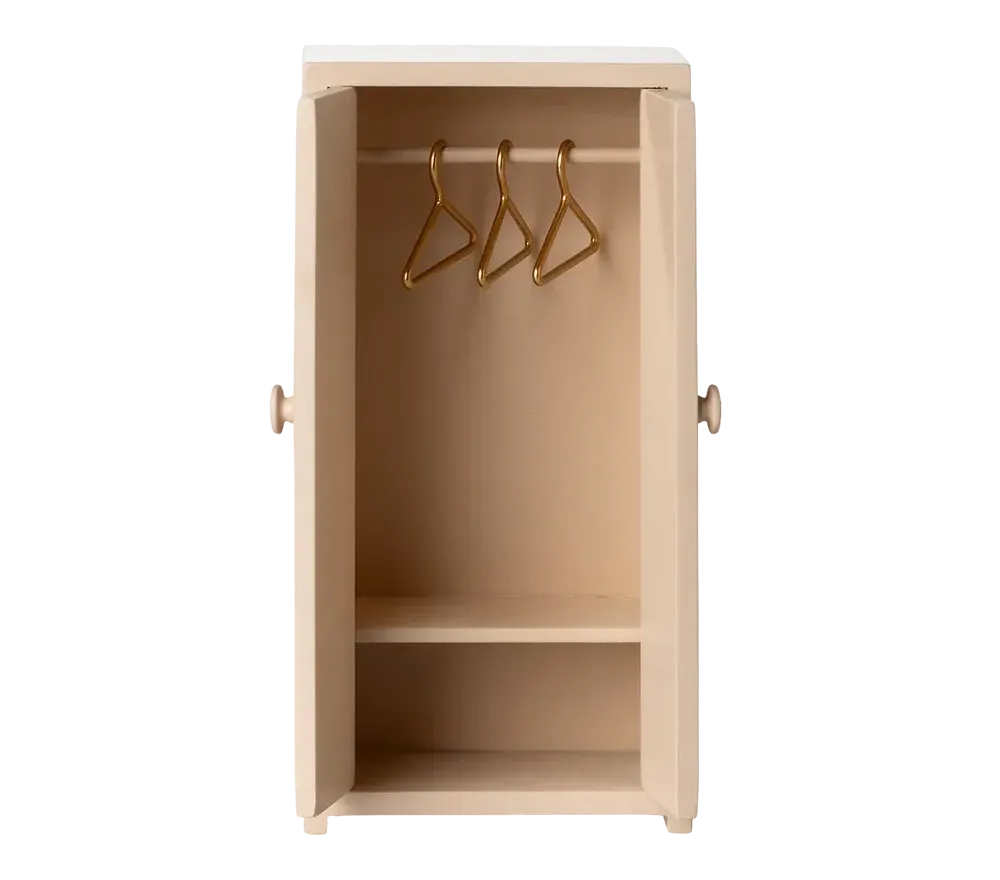 Un adorabile armadio in legno color rosa chiaro per i topini Maileg. Al suo interno ha un ripiano e 3 appendini dorati. Alto 14 cm, largo 7 cm e profondo 4 cm.