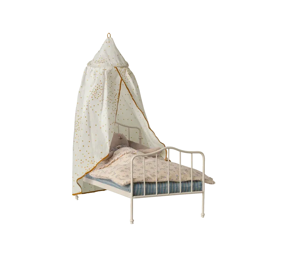Un elegantissimo baldacchino bianco con dettagli dorati, da appendere sopra i lettini Maileg.
