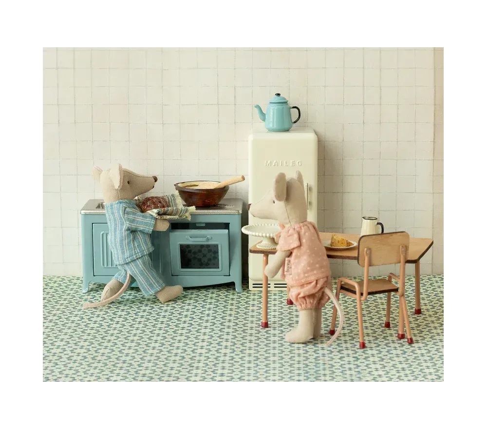Ha anta e forno che si aprono, lavandino e fornelli. Nel forno sta cuocendo una deliziosa torta (compresa). La misura è perfetta per i topini Maileg.