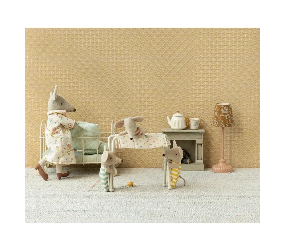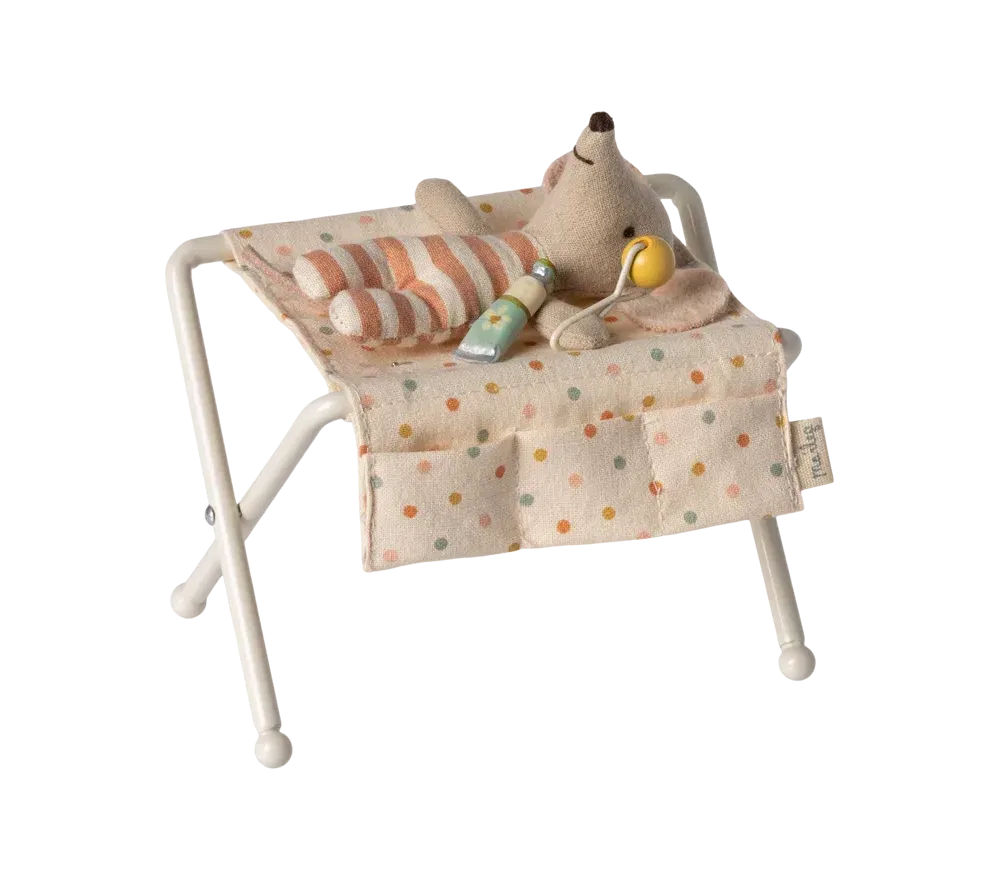Un carinissimo fasciatoio per i topini bebè! E' dotato di due taschine per la crema cambio e per un giochino con cui intrattenere il piccino. Alto circa 7,5 cm e largo 7,5 cm. In cotone e metallo.