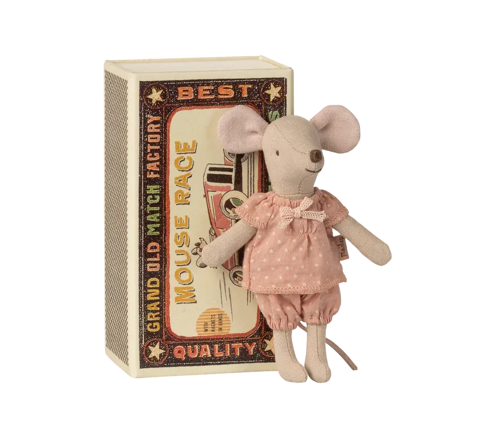 Classico articolo Maileg, la topolina Big Sister è pronta per ore di gioco e dorme nella sua scatola di fiammiferi.