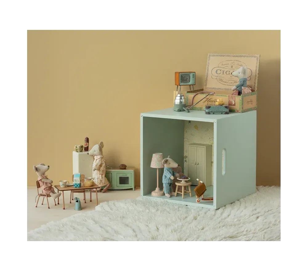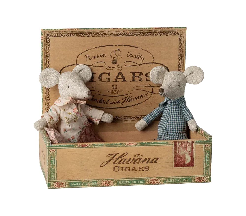 Nella grande famiglia di topini Maileg non potevano certo mancare i nonni! Entrambi in versione "notte", dormono in una scatola di sigari.