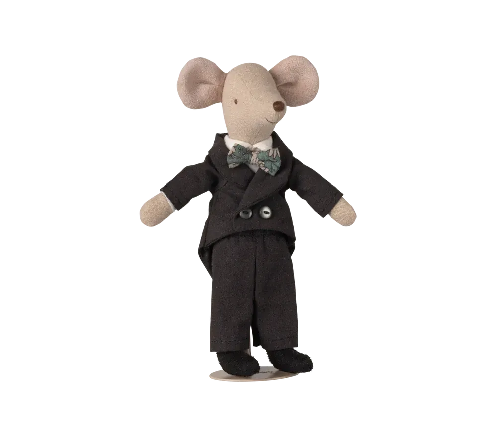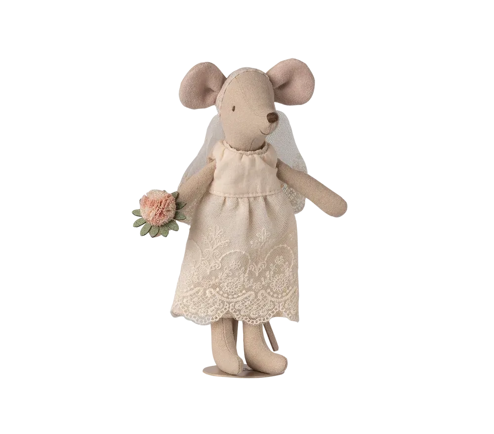 Un delizioso cofanetto con i topini sposo e sposa, pronti per un matrimonio da favola. Il topino indossa uno elegante frac e la sposa è meravigliosa nel suo abito decorato in pizzo.