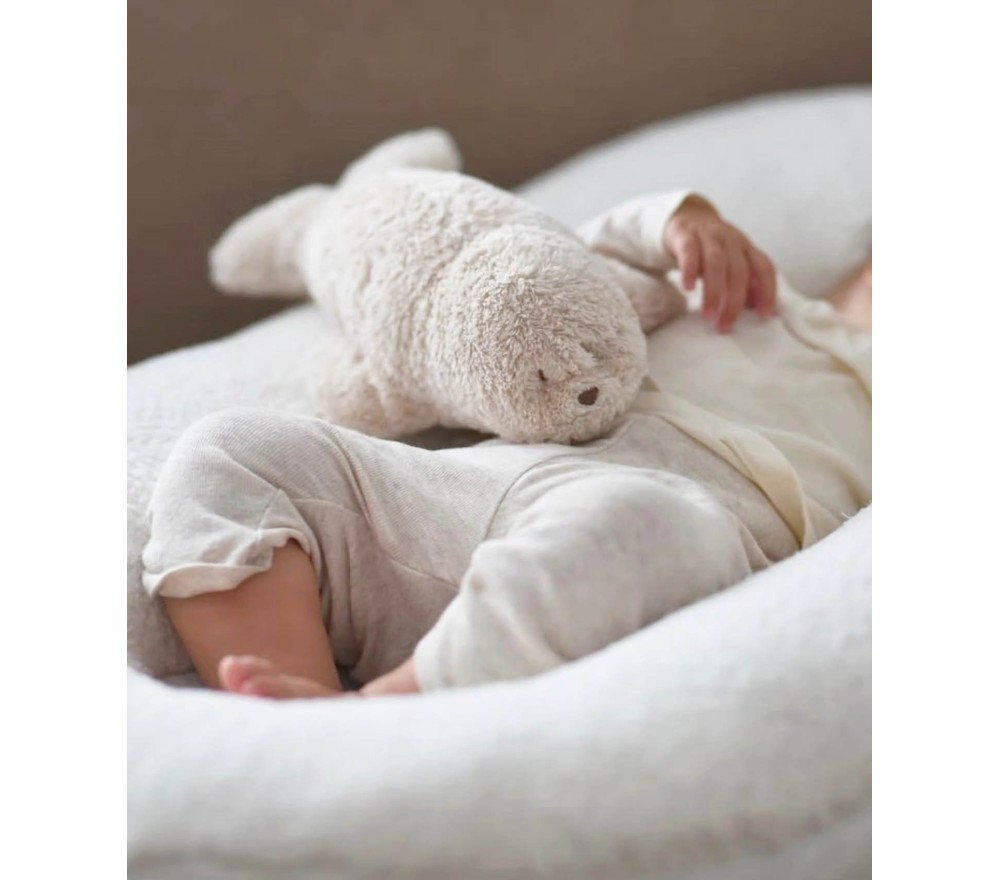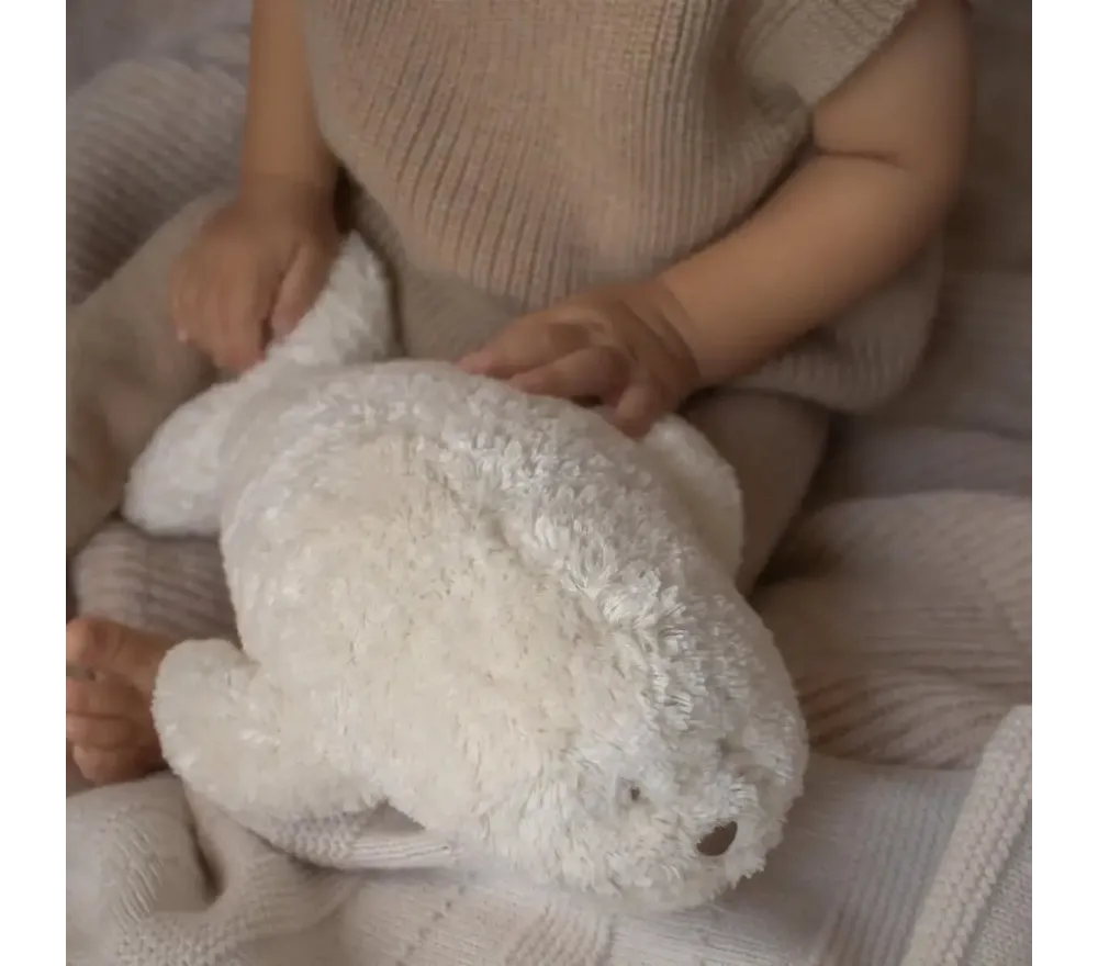 La foca in cotone organico di Moonie è candida e dolcissima, pronta per accompagnare la nanna dei più piccini.