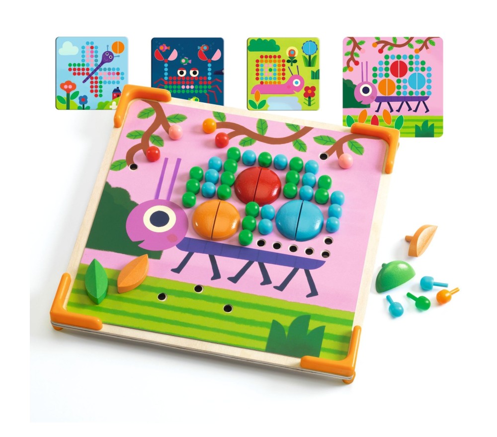 Un gioco classico dove i chiodini in legno di varie forme rappresentano le tessere. I bimbi, sviluppando le loro capacità creative, riprodurranno 8 diversi animali grazie alle plance intercambiabili, da incastrare sulla base in legno.