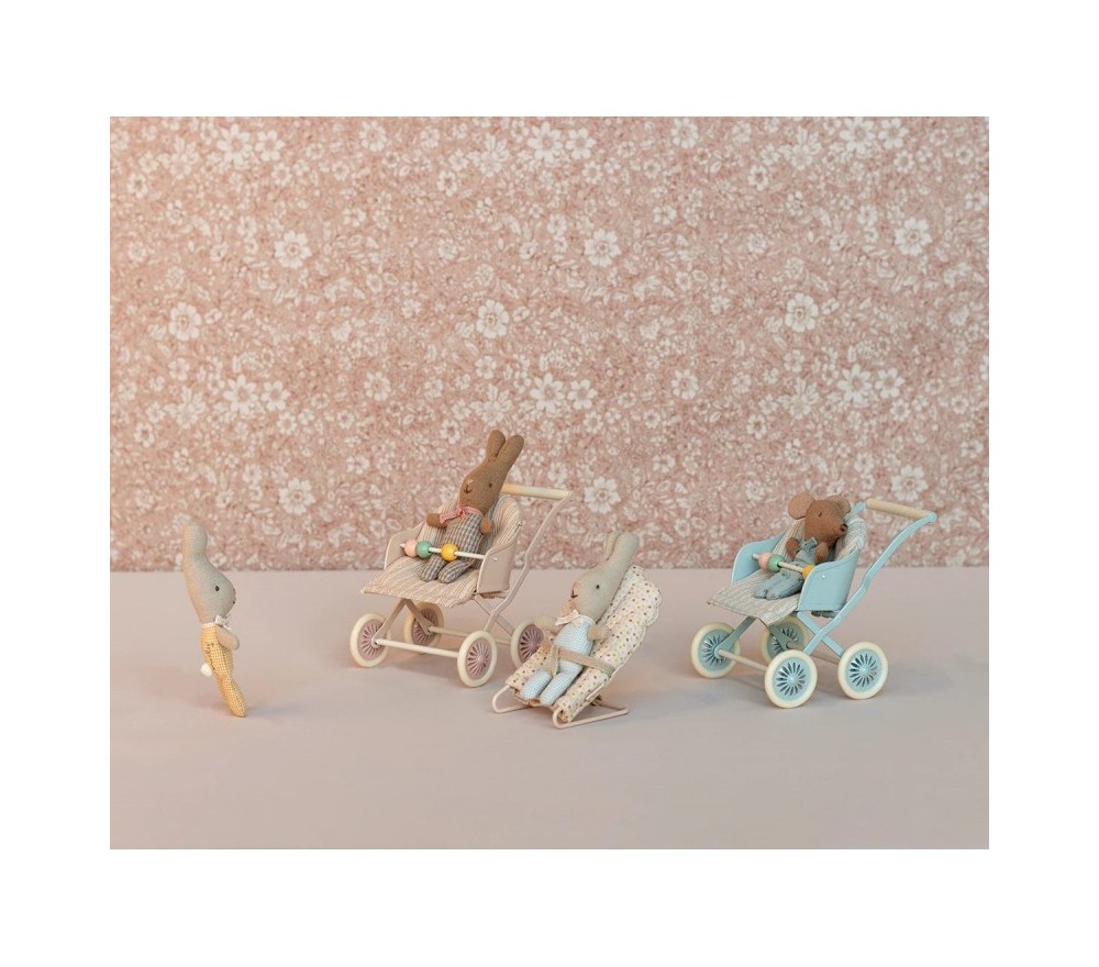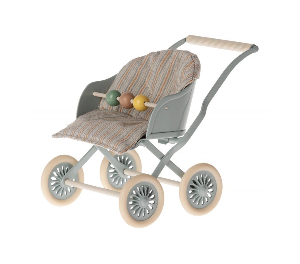 Un adorabile passeggino in metallo, con dei giochini per intrattenere i topini bebè o i personaggi My. Il passeggino può portare anche 2 personaggi insieme. Il manico può essere spostato a seconda di come si desidera che i piccoli siano rivolti (verso la "strada" o verso i genitori).