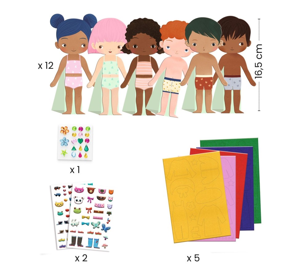 I bimbi si divertiranno un mondo a vestire in modo creativo i 12 personaggi (sia maschi che femmine) con dei morbidi adesivi in feltro.