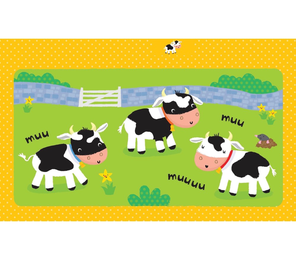 Un bel libro cartonato con pannello sonoro laterale. I piccolini si divertiranno a guardare le illustrazioni coloratissime e a premere i tasti corrispondenti per ascoltare musichette, versi e rumori della fattoria.