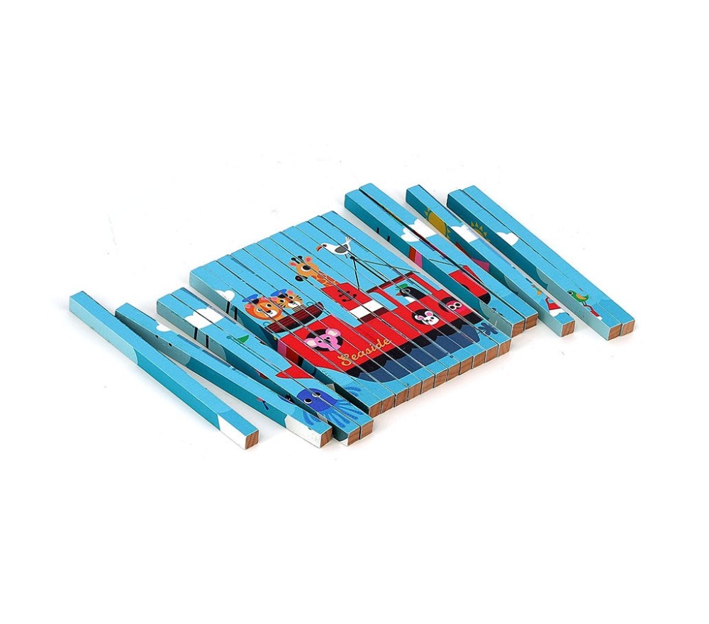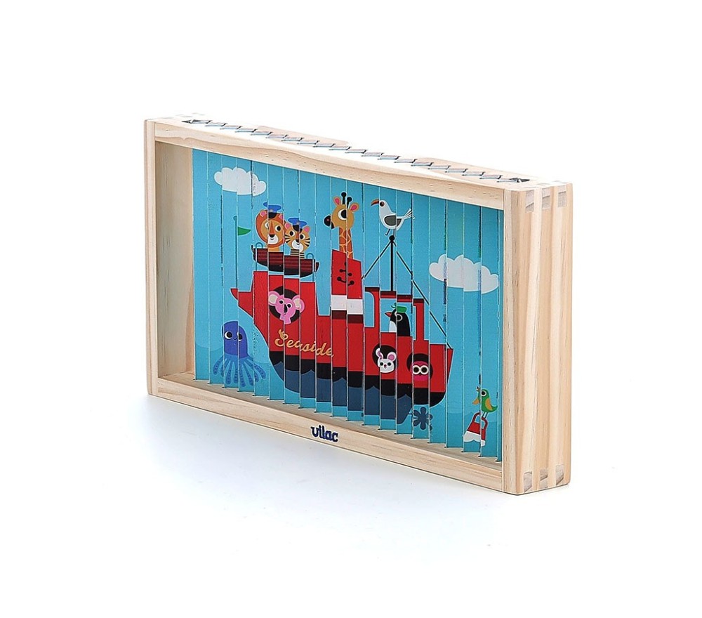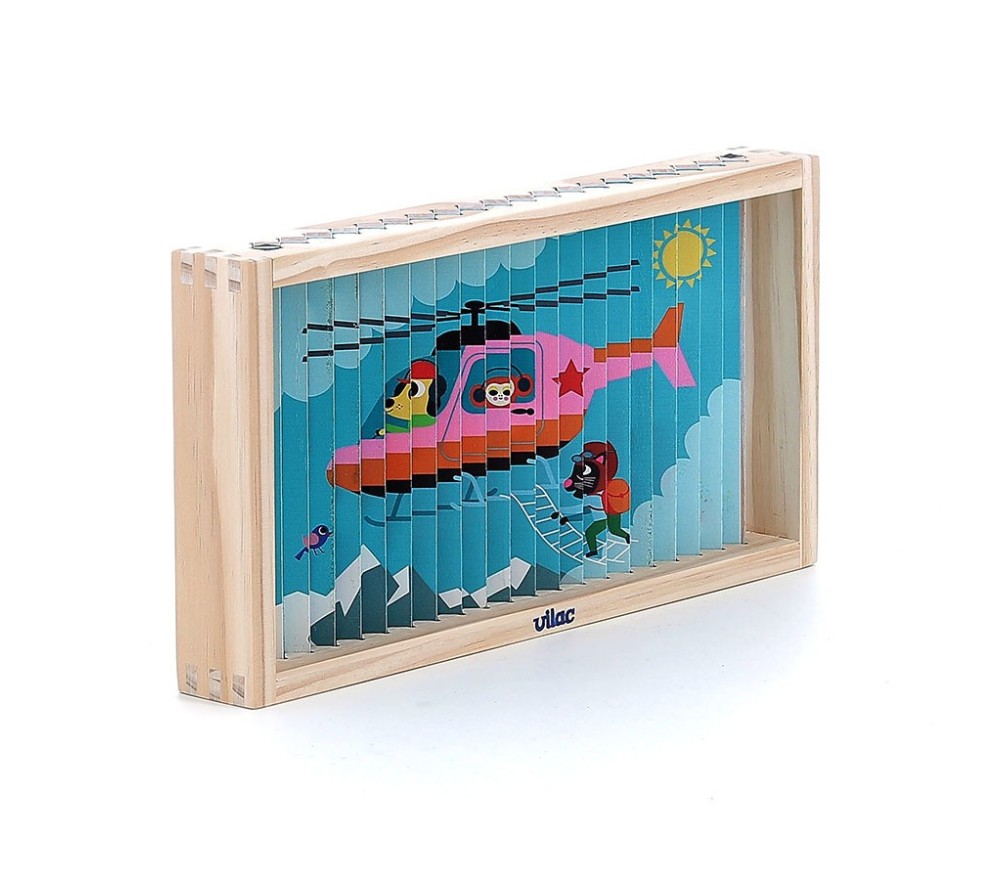 Un puzzle in legno con un tocco magico! Se mi sporgo a sinistra, vedo un elicottero. Se mi sporgo a destra, scopro una barca.