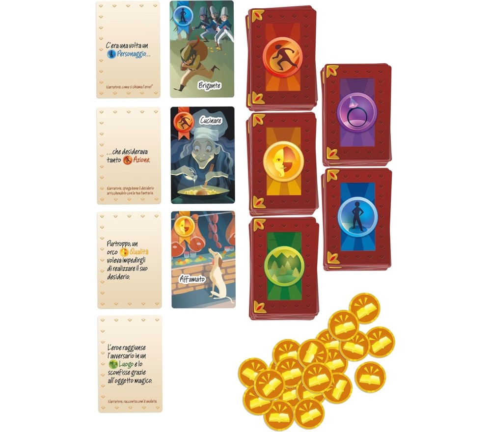 Come si Gioca: Il Narratore legge una carta. I giocatori mettono 1 carta categoria coperta sul tavolo Il Narratore, ne sceglie 1 per la sua storia
