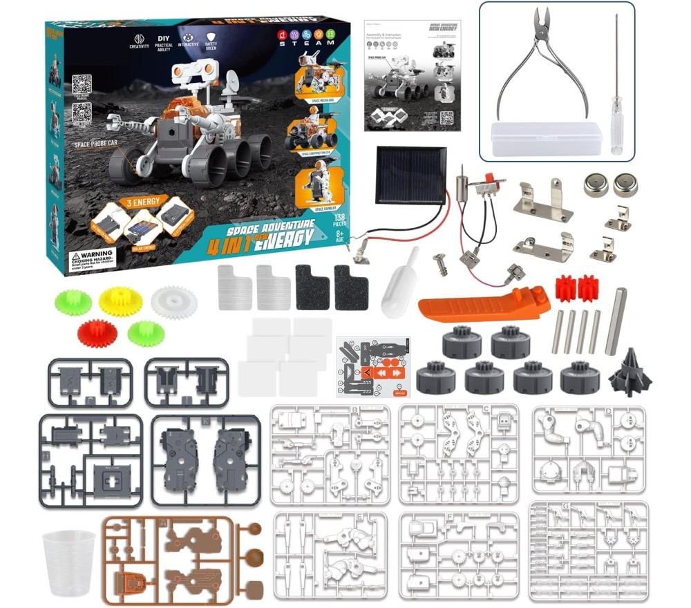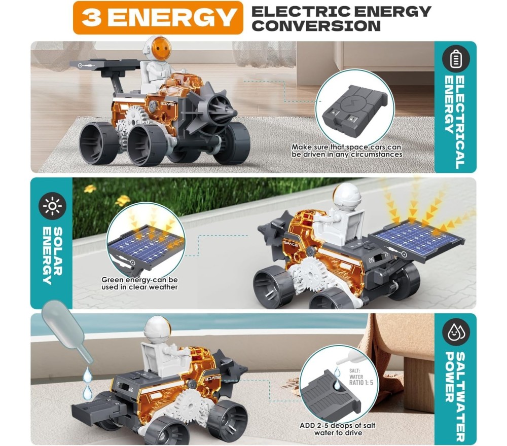 Un stimolante e interessante set di costruzioni, che permette di realizzare alternativamente 4 diversi modelli di veicoli spaziali (un rover, un razzo, un cyber dog e un robot) che funzionano davvero grazie al motore, che si può alimentare a scelta con batterie, energia solare o soluzione di acqua e sale.