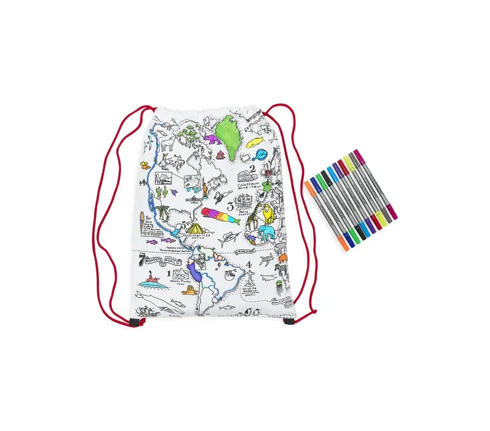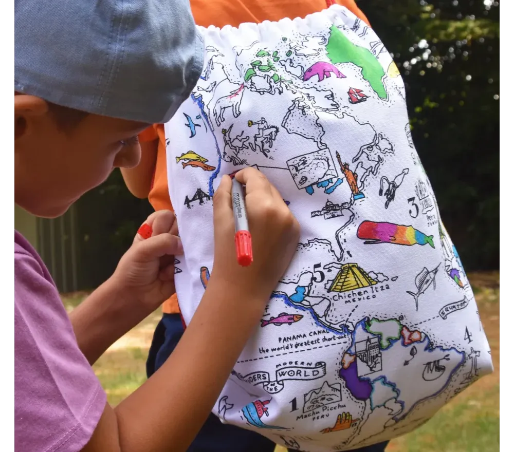 Questa fantastica sacca-zainetto è tutta da colorare! Grazie ai pennarelli lavabili i bimbi potranno divertirsi a personalizzarla come preferiscono.