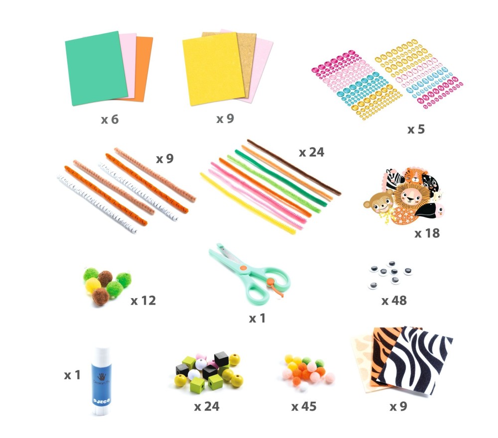 10 schede pretagliate e illustrate, 18 fogli di feltro, 6 fogli di schiuma, 24 perline di legno, 45 pompon, 33 fili di ciniglia, gioielli autoadesivi, occhi mobili autoadesivi, 1 paio di forbici, 1 tubo di colla + 10 schede di idee.