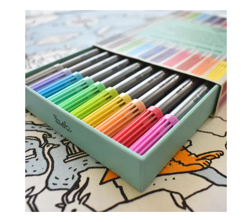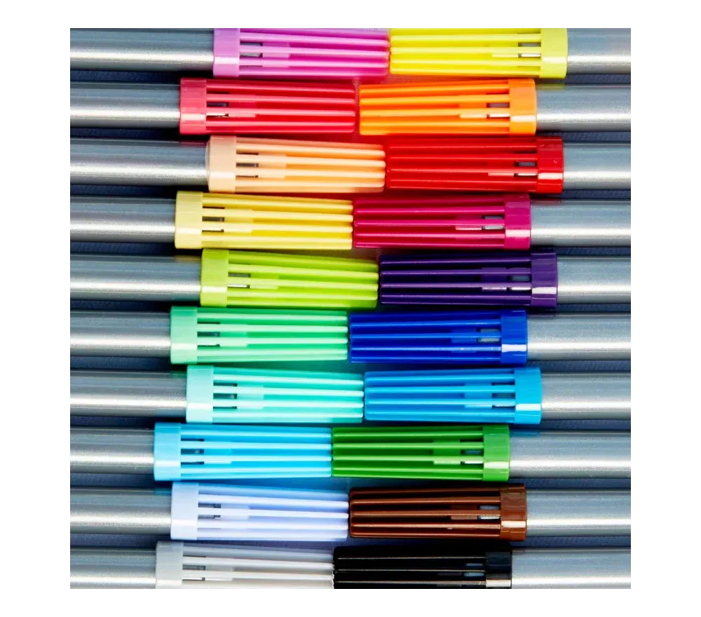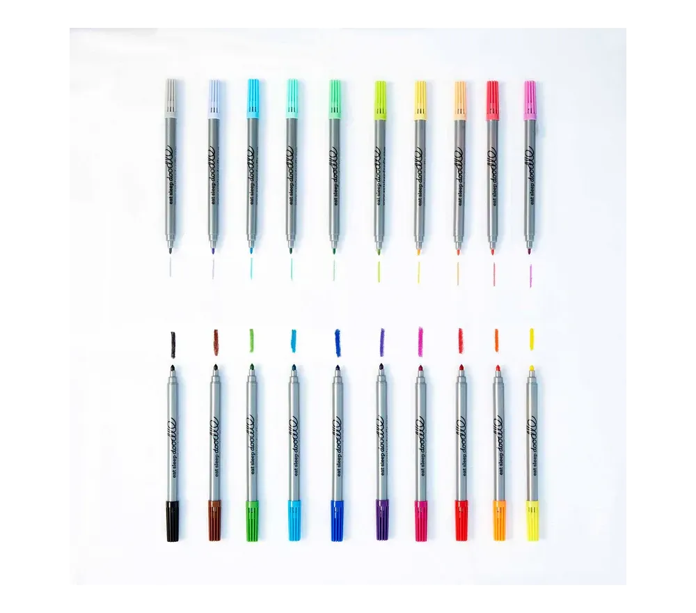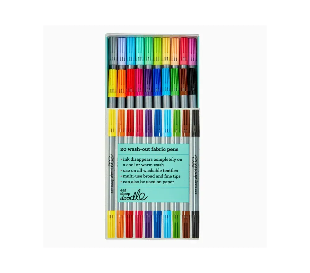 Questo coloratissimo set comprende ben 20 pennarelli lavabili e atossici a doppia punta (fine e larga) che possono essere utilizzati non solo sui tessuti, ma anche su carta.