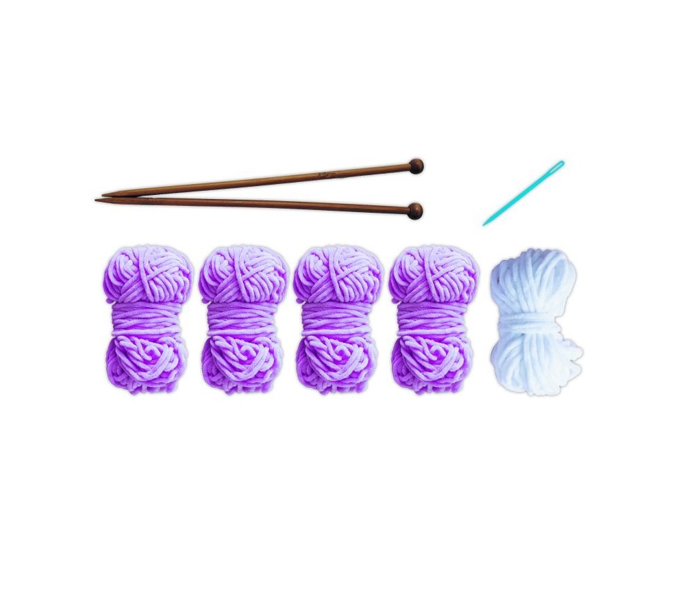 Il kit include 4 gomitoli di filato di ciniglia, 1 gomitolo di filato bianco per occhi e naso, 1 paio di ferri da maglia (25 cm), 1 ago da lana in plastica e 1 libretto con istruzioni passo passo e foto.