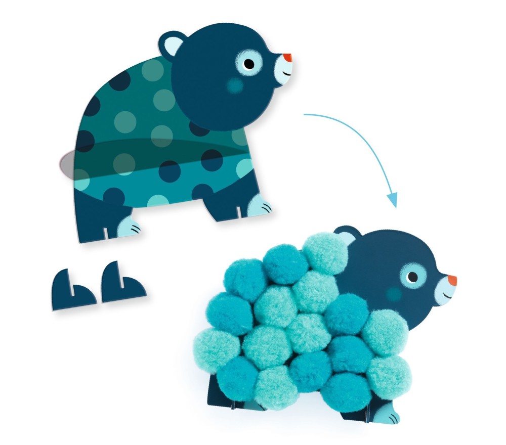 Contenuto: 3 carte animale sagomate (25 x 17 cm) con una parte autoadesiva, 50 grossi pompon colorati (diam. 4 cm), 6 supporti per far stare in piedi gli animali e 1 libretto di istruzioni a colori.