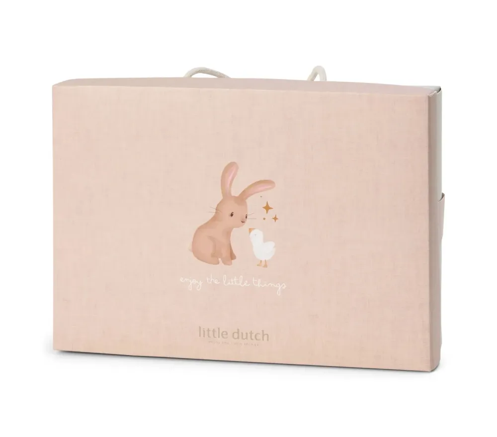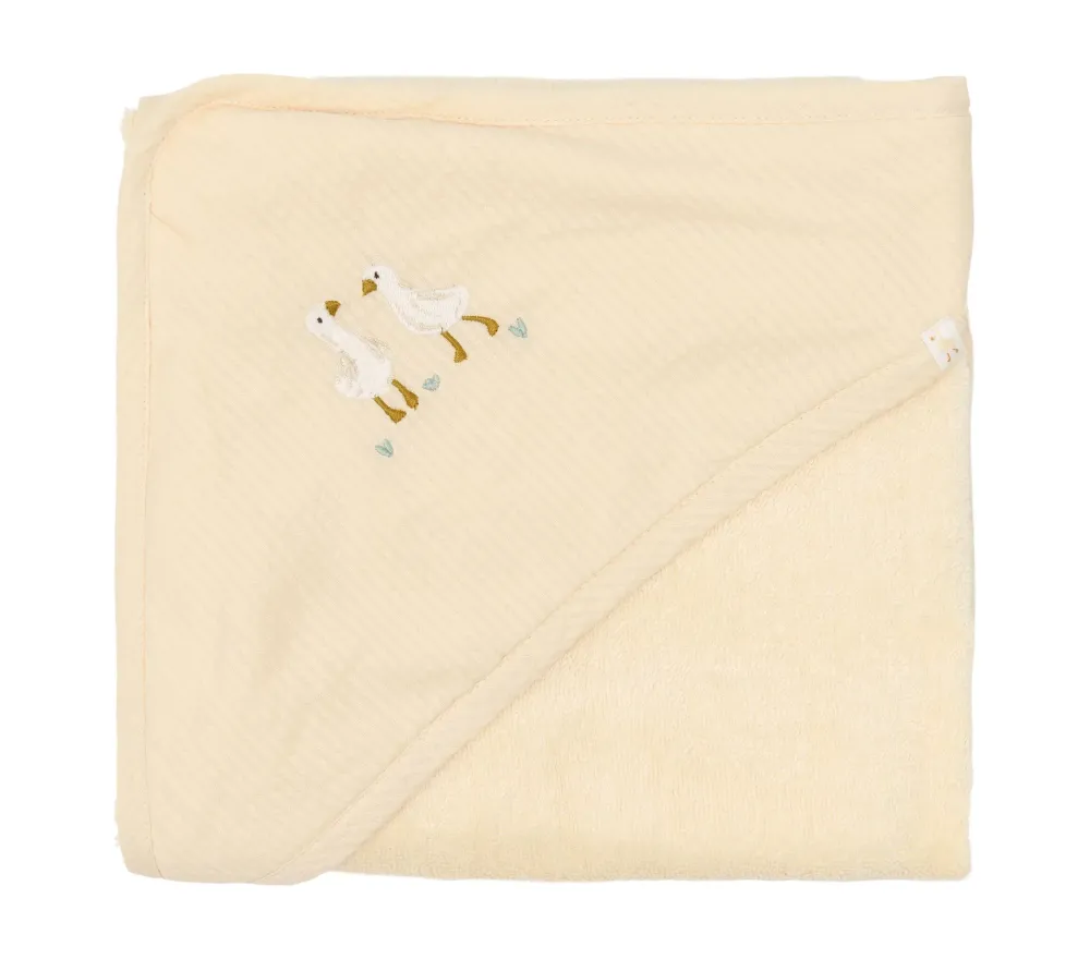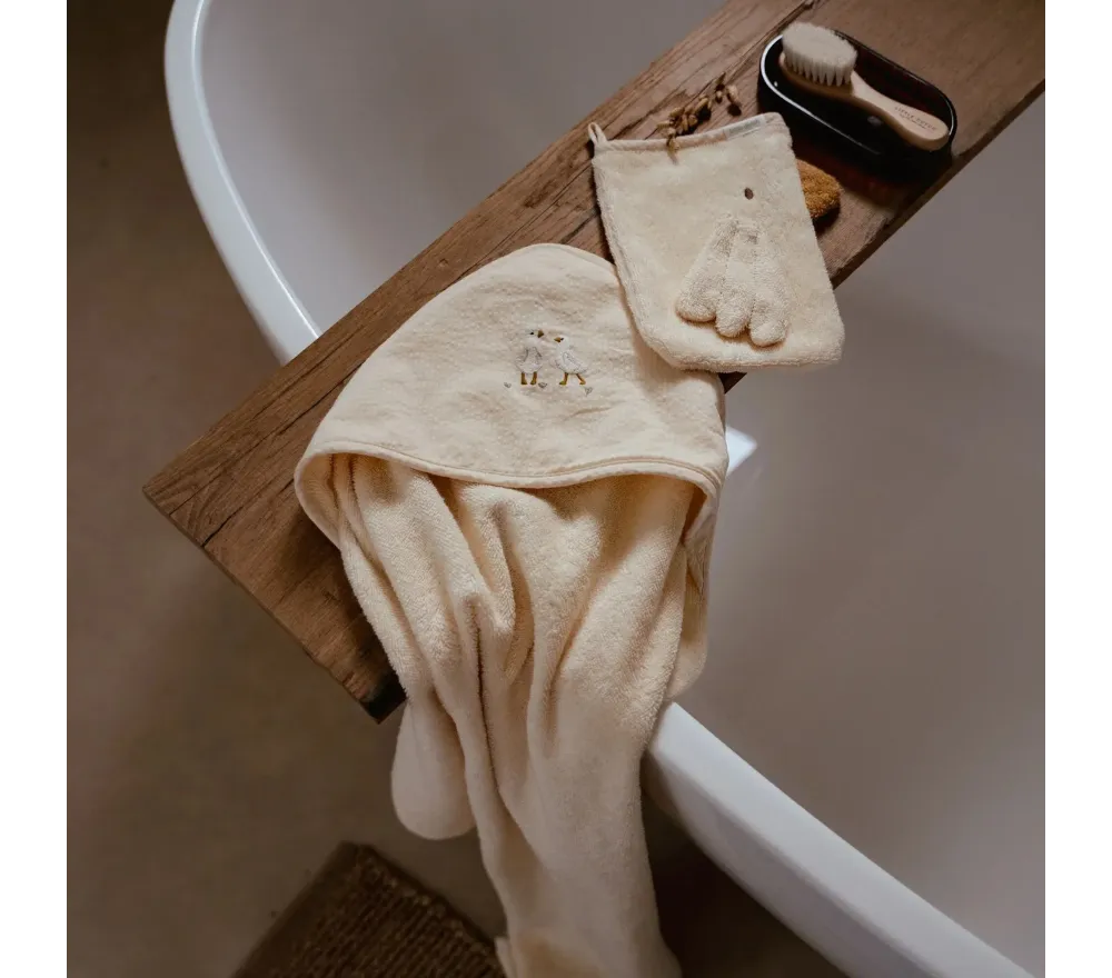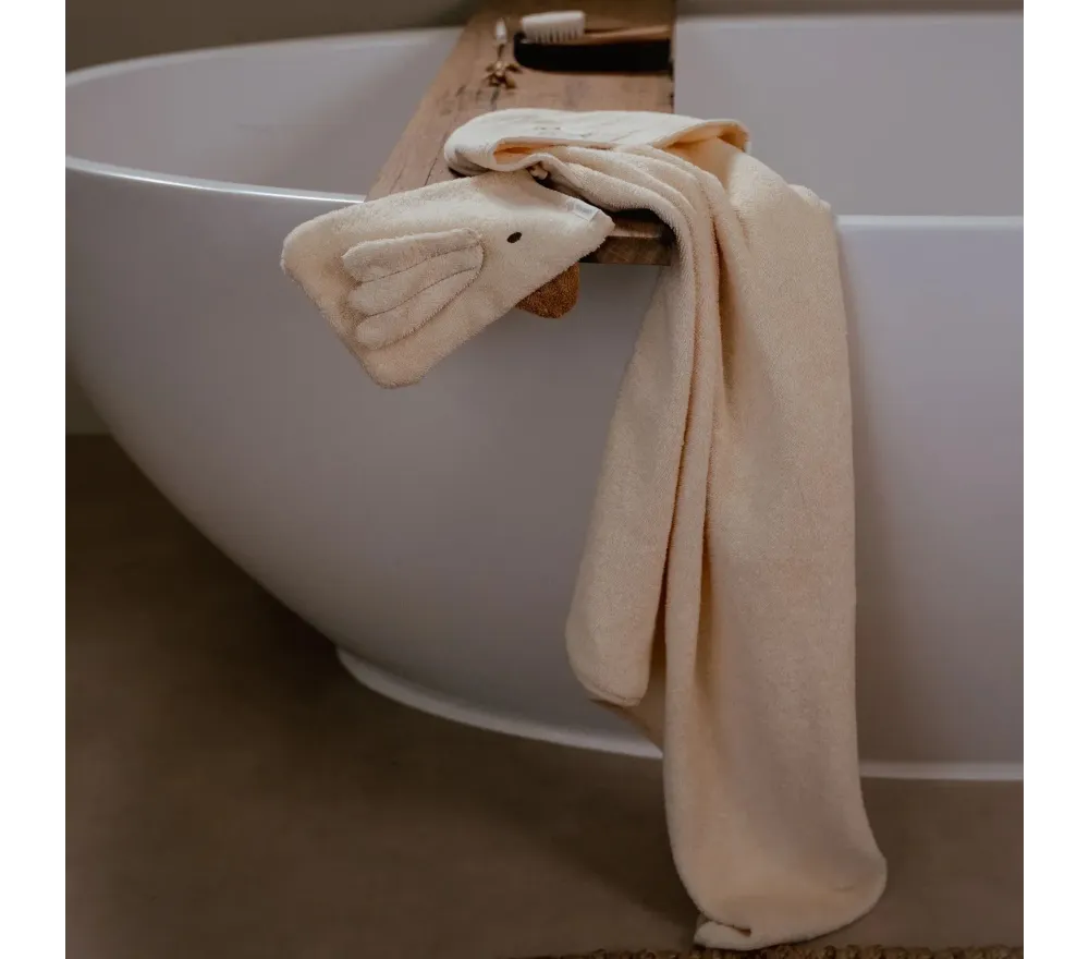 Un'idea regalo utile e tenera per i neonati: un set con un morbidissimo accappatoio triangolare con ricamate le ochette di Little Dutch, abbinato a un guanto spugna... a forma di oca!